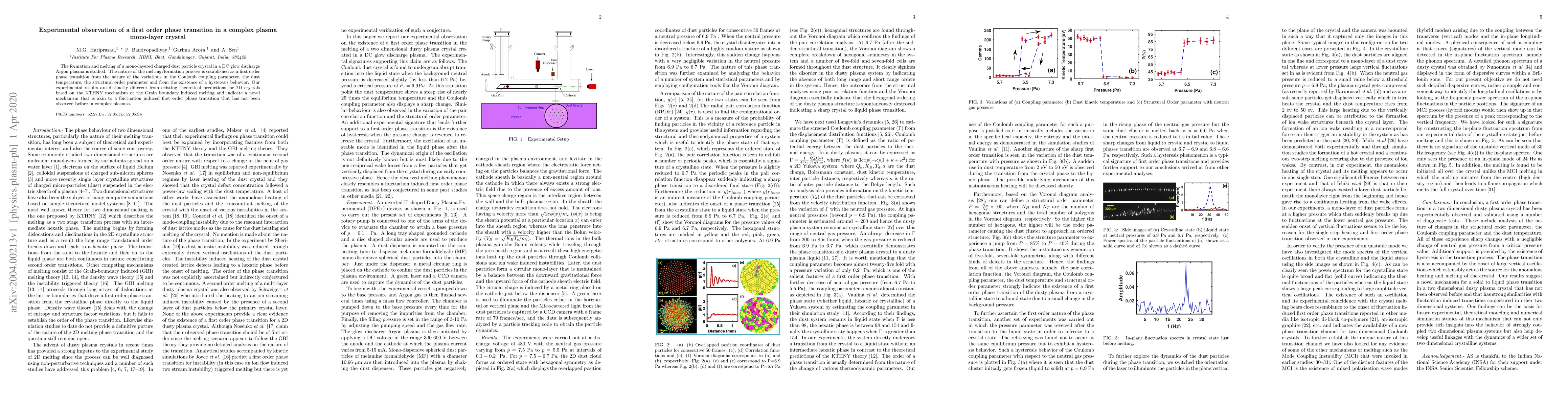 The formation and melting of a mono-layered charged dust particle crystal in a DC glow discharge Argon plasma is studied. The nature of the melting/formation process is established as a first order phase transition from the nature of the variations in the Coulomb coupling parameter, the dust temperature, the structural order parameter and from the existence of a hysteresis behavior. Our experimental results are distinctly different from existing theoretical predictions for 2D crystals based on the KTHNY mechanism or the Grain boundary induced melting and indicate a novel mechanism that is akin to a fluctuation induced first order phase transition that has not been observed before in complex plasmas.