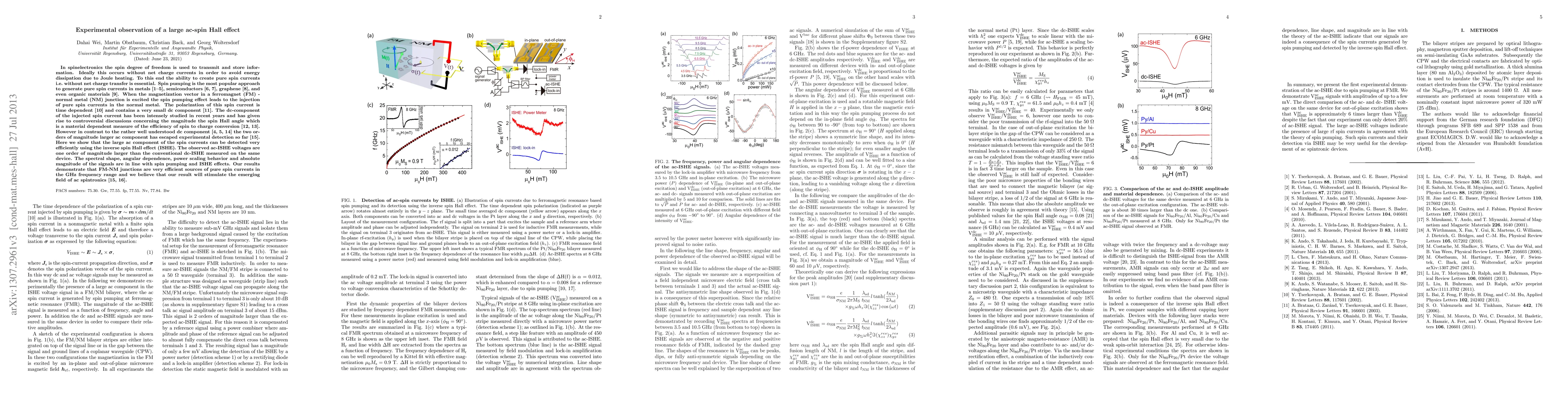 The paper reports the experimental observation of a large ac-spin Hall effect, one order of magnitude larger than the conventional dc-spin Hall effect, in FM-NM junctions. This discovery, made using the inverse spin Hall effect (ISHE), demonstrates the efficiency of these junctions as sources of pure spin currents in the GHz frequency range, opening avenues for the development of ac spintronics.