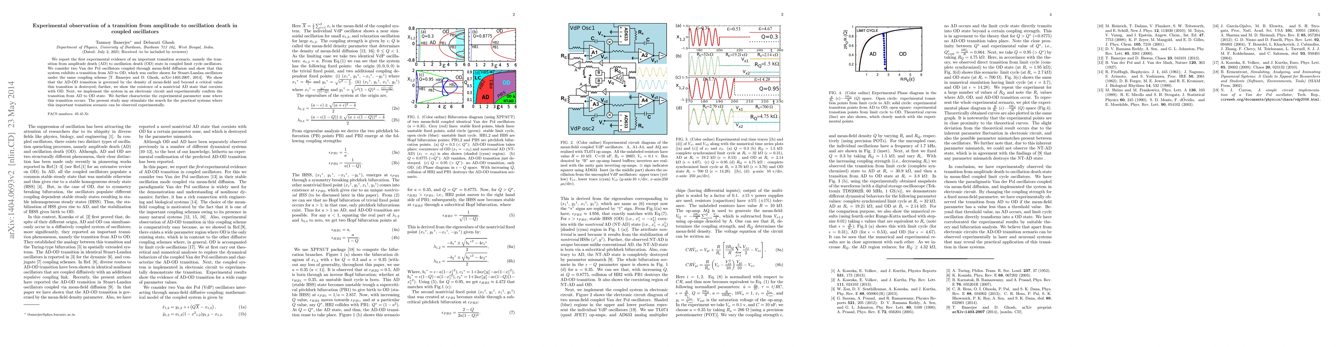 This paper reports the first experimental observation of a transition from amplitude death to oscillation death in coupled Van der Pol oscillators, confirming a theoretical transition previously observed in Stuart-Landau oscillators. The study characterizes the parameter zone for this transition and suggests potential practical applications for observing this phenomenon.