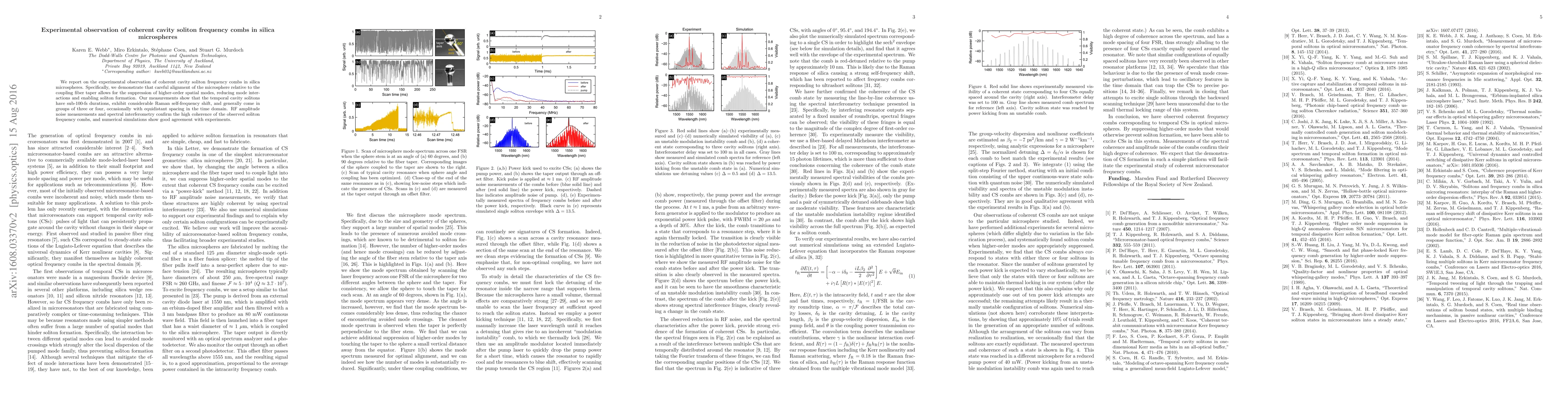 Researchers experimentally observe coherent cavity soliton frequency combs within silica microspheres, achieving suppression of higher-order modes to facilitate soliton formation. The solitons display sub-100-fs durations, significant Raman self-frequency shift, and high coherence confirmed by RF noise measurements and spectral interferometry, with numerical simulations corroborating the findings.