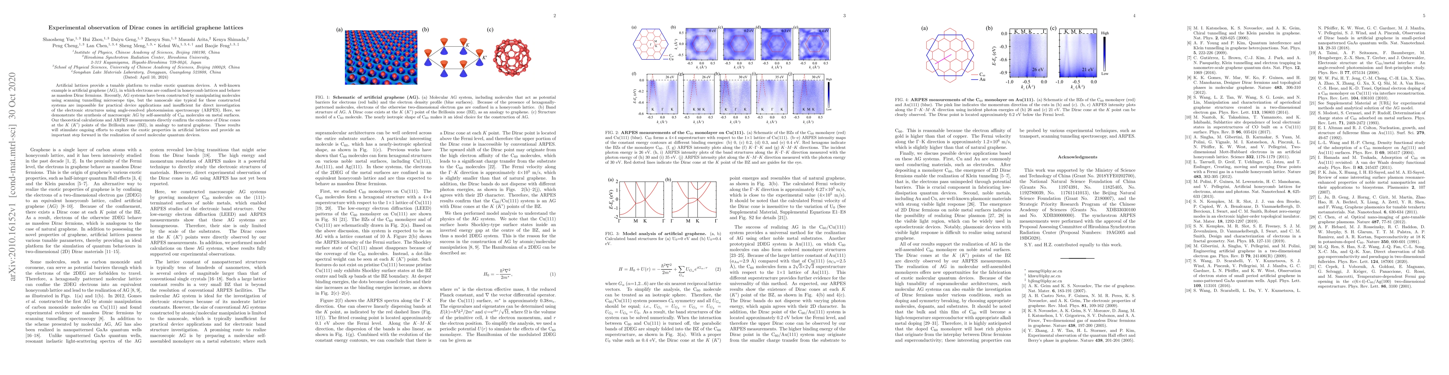 This paper reports the synthesis of macroscopic artificial graphene (AG) using self-assembled C$_{60}$ molecules on metal surfaces, confirming the presence of Dirac cones via theoretical calculations and ARPES measurements, akin to natural graphene. This advancement paves the way for exploring novel quantum devices.