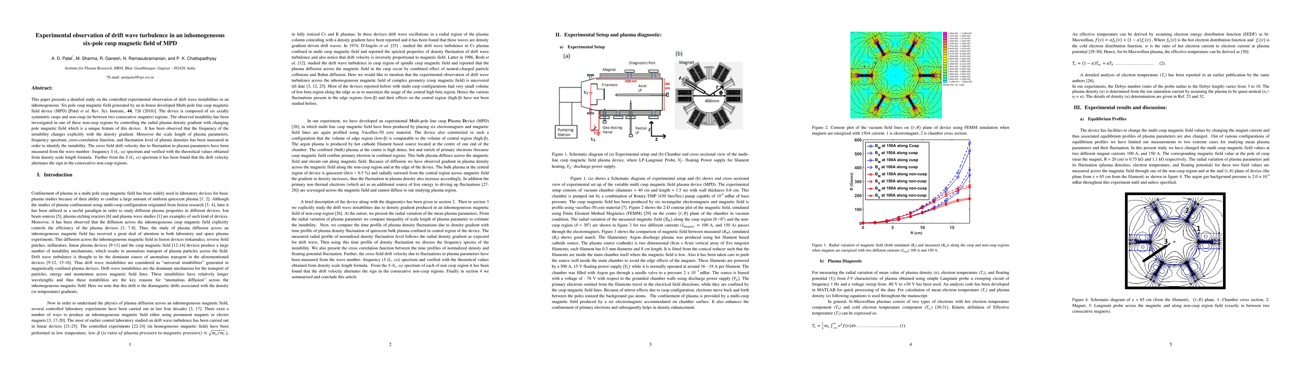 This paper presents a detailed study on the controlled experimental observation of drift wave instabilities in an inhomogeneous Six pole cusp magnetic field generated by an in-house developed Multi-pole line cusp magnetic field device (MPD) [Patel et al. Rev. Sci. Instrum., 44, 726 (2018)]. The device is composed of six axially symmetric cusps and non-cusp (in between two consecutive magnets) regions. The observed instability has been investigated in one of these non-cusp regions by controlling the radial plasma density gradient with changing pole magnetic field which is a unique feature of this device. It has been observed that the frequency of the instability changes explicitly with the density gradient. Moreover the scale length of plasma parameters, frequency spectrum, cross-correlation function, and fluctuation level of plasma densities has been measured in order to identify the instability. The cross field drift velocity due to fluctuation in plasma parameters have been measured from the wave number- frequency S (kz, {\omega}) spectrum and verified with the theoretical values obtained from density scale length formula. Further from the S (kz, {\omega}) spectrum it has been found that the drift velocity alternates the sign in the consecutive non-cusp regions.