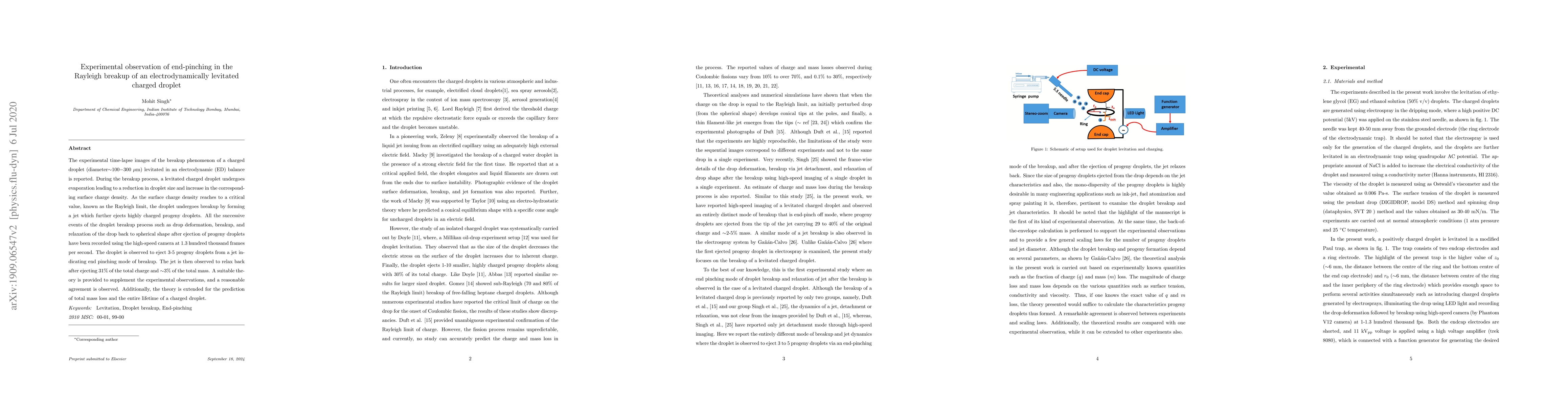 This study experimentally observes the Rayleigh breakup of an electrodynamically levitated charged droplet, capturing the end-pinching mode where 3-5 progeny droplets are ejected from a jet. The high-speed imaging and accompanying theoretical model provide insights into the droplet's deformation, breakup, and relaxation processes.