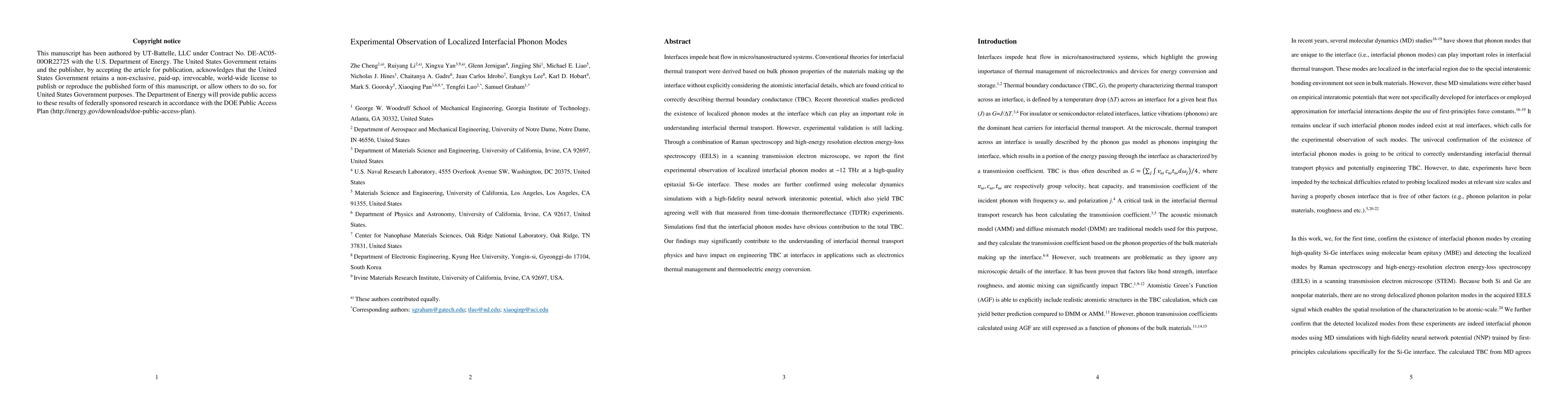 This paper reports the first experimental observation of localized interfacial phonon modes at a Si-Ge interface using Raman spectroscopy and EELS, confirming their role in thermal boundary conductance. Molecular dynamics simulations corroborate the findings, suggesting these modes significantly contribute to interfacial thermal transport.