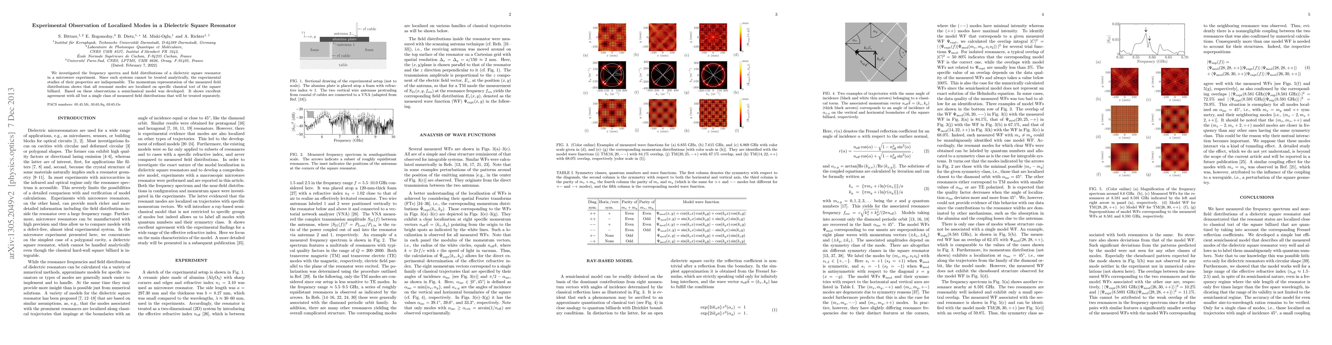 This paper reports on experimental observations of localized modes in a dielectric square resonator, revealing that resonant modes are confined to specific classical tori. A semiclassical model developed based on these findings aligns well with the majority of the measured field distributions.