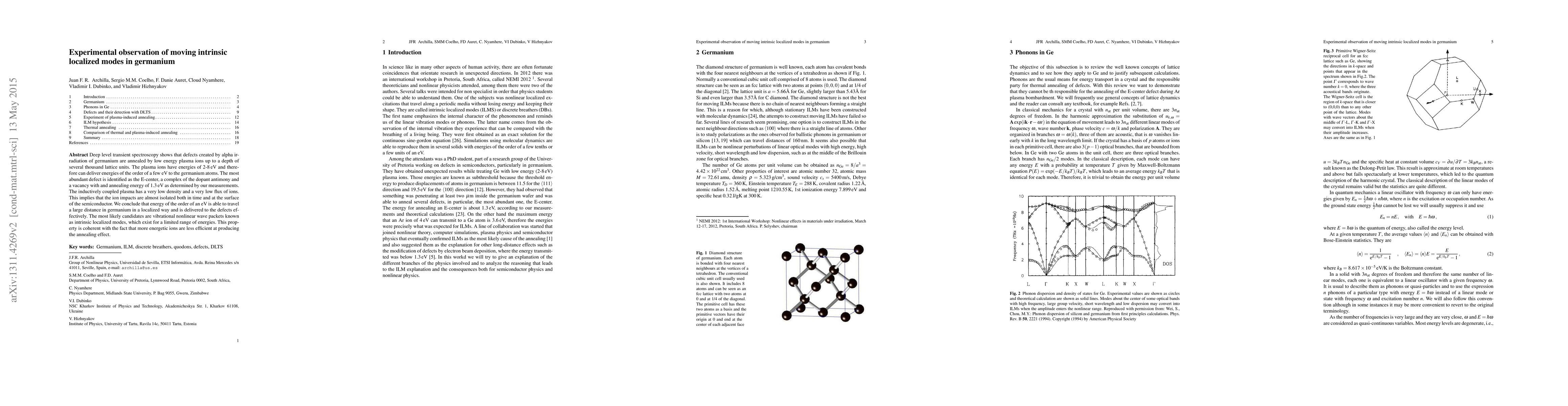 This study demonstrates that low-energy plasma ions can anneal defects in alpha-irradiated germanium, identifying the E-center as the predominant defect. The findings suggest that intrinsic localized modes, or vibrational nonlinear wave packets, effectively transport energy over large distances in germanium.