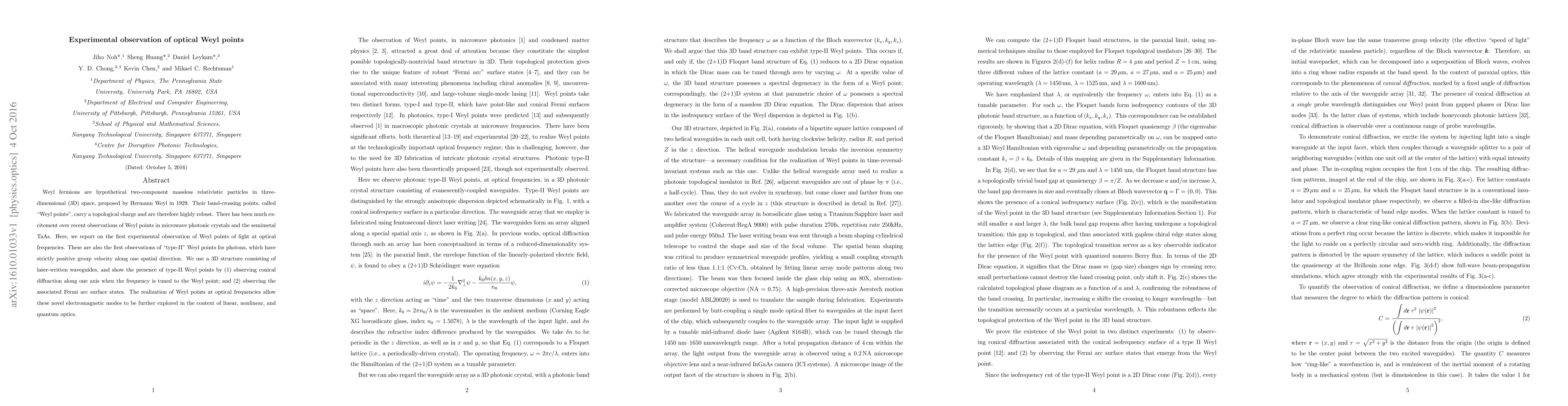 This paper reports the first experimental observation of optical Weyl points at optical frequencies, specifically type-II Weyl points with positive group velocity. The findings are demonstrated through conical diffraction and Fermi arc surface states in a 3D laser-written waveguide structure, opening new avenues for exploring these novel electromagnetic modes in various optical contexts.