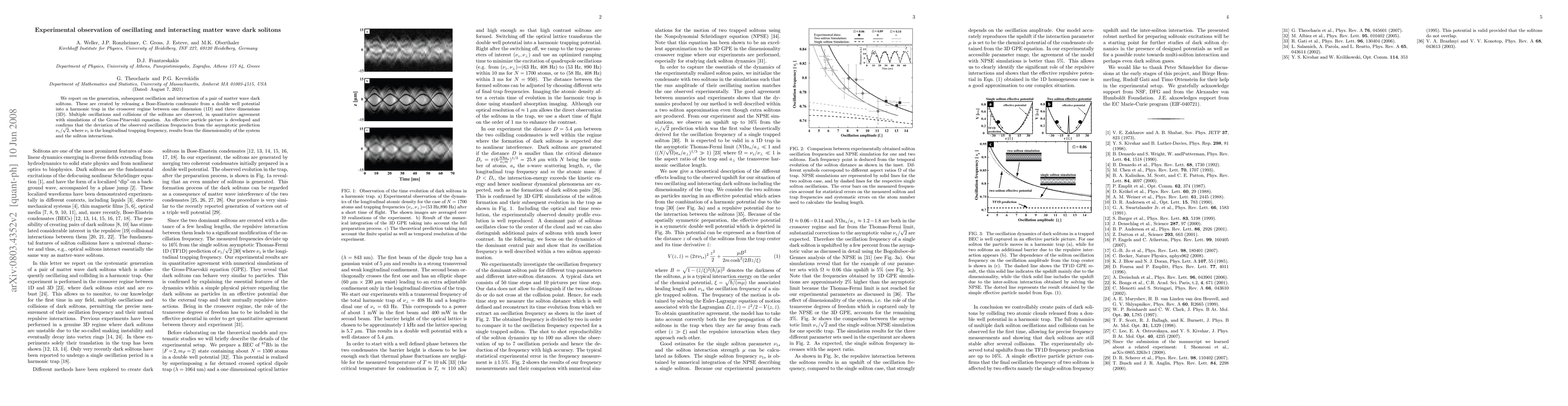 This paper reports the generation and observation of oscillating and interacting matter wave dark solitons in a Bose-Einstein condensate transitioning from a double well potential to a harmonic trap. The observed oscillation frequencies match simulations based on the Gross-Pitaevskii equation, with deviations from predictions attributed to system dimensionality and soliton interactions.