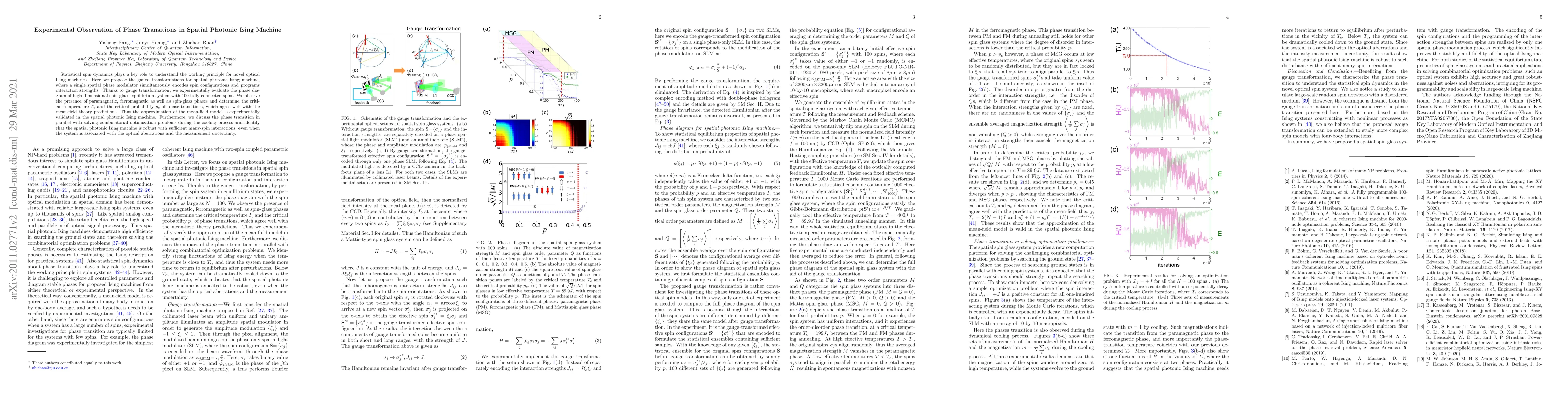 This paper experimentally investigates phase transitions in a spatial photonic Ising machine using gauge transformations, observing paramagnetic, ferromagnetic, and spin-glass phases and validating mean-field theory predictions. The study also demonstrates the machine's robustness in solving optimization problems despite optical aberrations and measurement uncertainties.