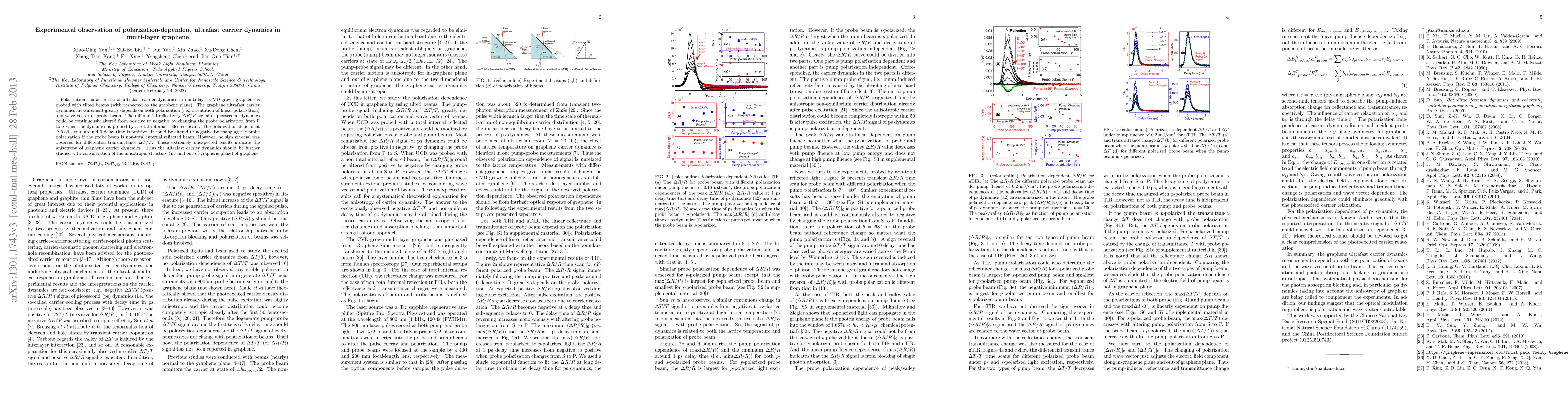 This research investigates the polarization-dependent ultrafast carrier dynamics in multi-layer CVD-grown graphene, revealing an anisotropic structure. The differential reflectivity signal can switch from positive to negative by altering probe polarization, suggesting significant polarization effects on graphene’s ultrafast carrier dynamics.
