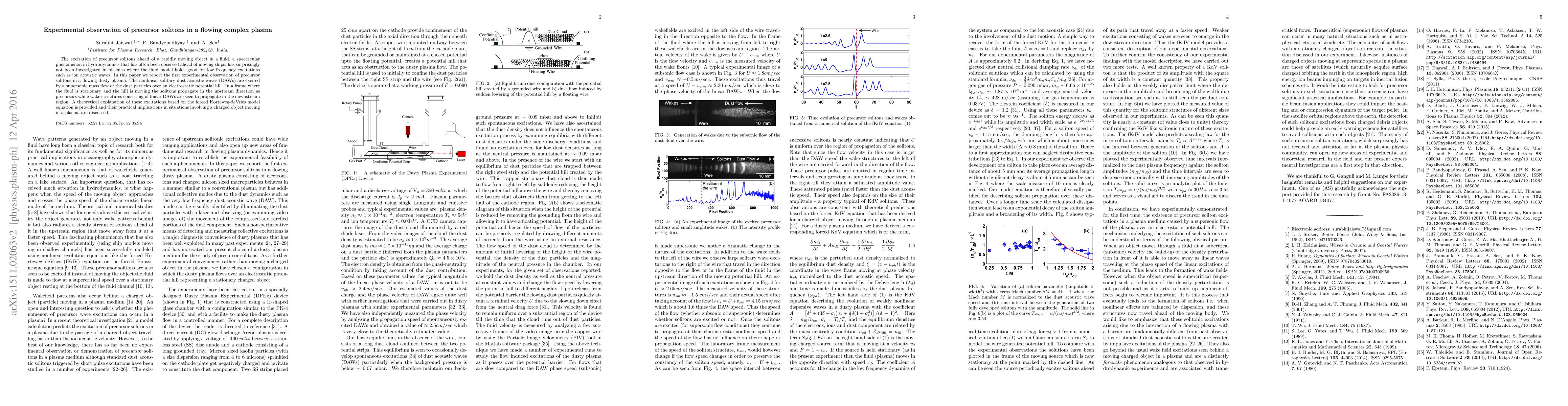 This paper reports the first experimental observation of precursor solitons in a flowing dusty plasma, where nonlinear solitary dust acoustic waves are generated by a supersonic mass flow over an electrostatic potential hill. The study also provides a theoretical explanation using the forced Korteweg-deVries model, discussing practical implications for charged objects moving in plasma environments.