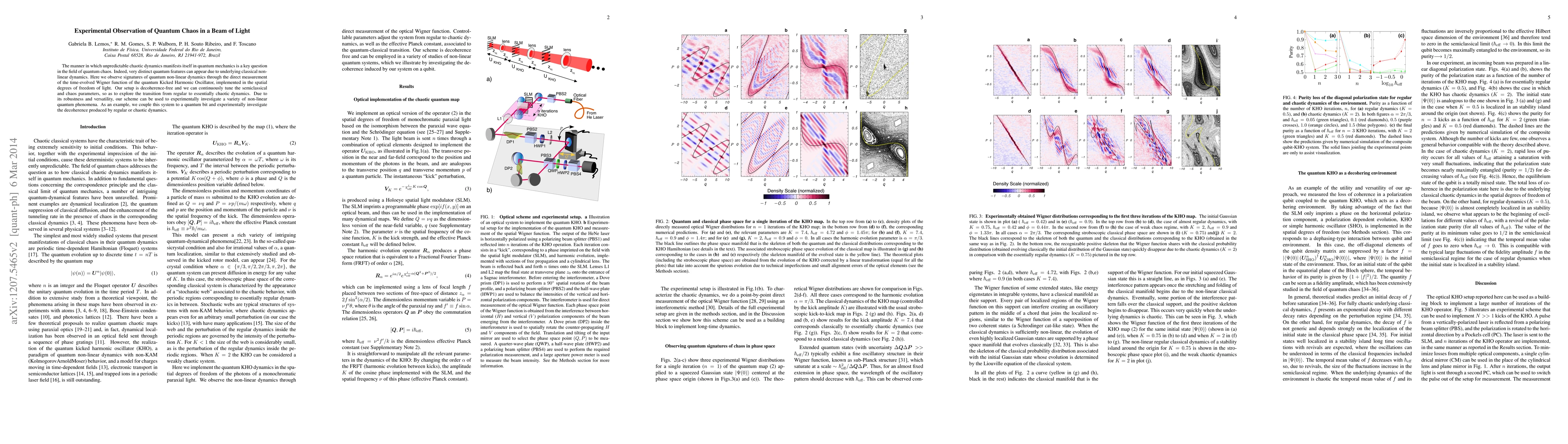 This paper reports the experimental observation of quantum chaos in a light beam, demonstrating the time-evolved Wigner function of the quantum-kicked harmonic oscillator. The study explores the transition from regular to chaotic dynamics and investigates the decoherence effects produced by these dynamics when coupled with a quantum bit.