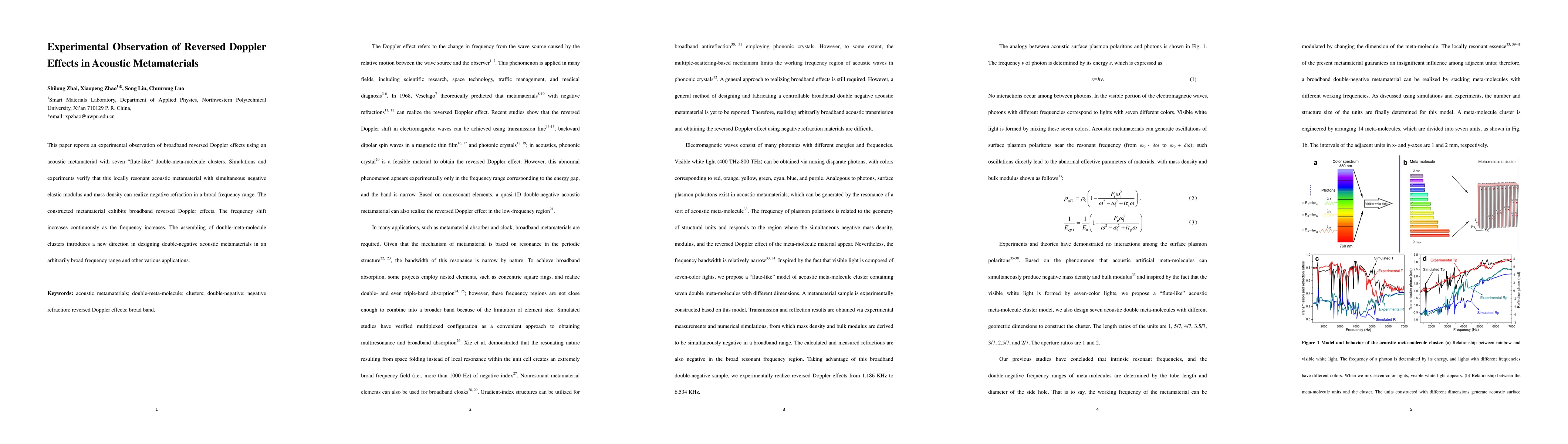 This research experimentally demonstrates broadband reversed Doppler effects in an acoustic metamaterial composed of seven flute-like double-meta-molecule clusters, revealing negative refraction and a continuously increasing frequency shift with frequency. The design paves the way for double-negative acoustic metamaterials over broad frequency ranges.