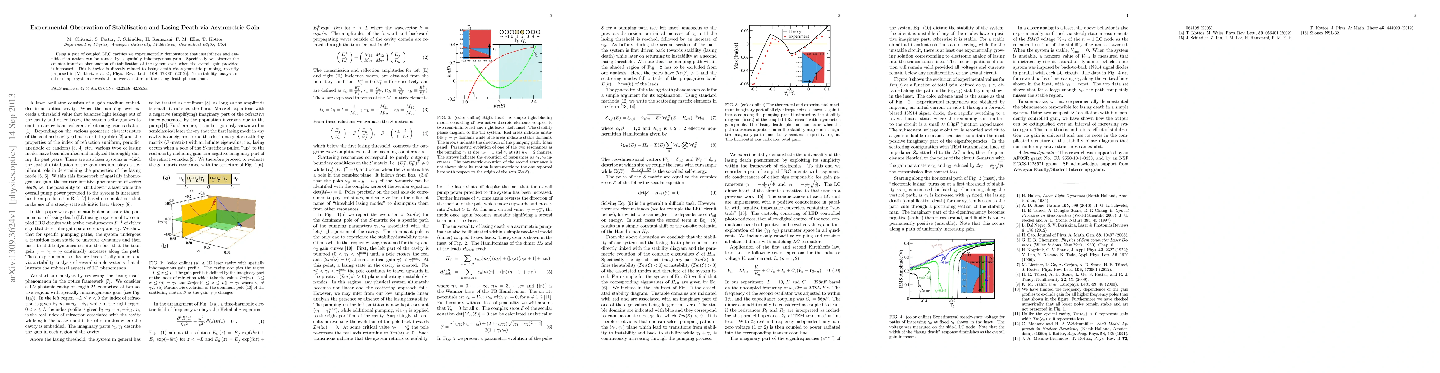 This paper experimentally demonstrates stabilization and lasing death in coupled LRC cavities through asymmetric gain, showing that increased overall gain can paradoxically stabilize the system. This behavior aligns with the recently proposed lasing death phenomenon via asymmetric pumping.