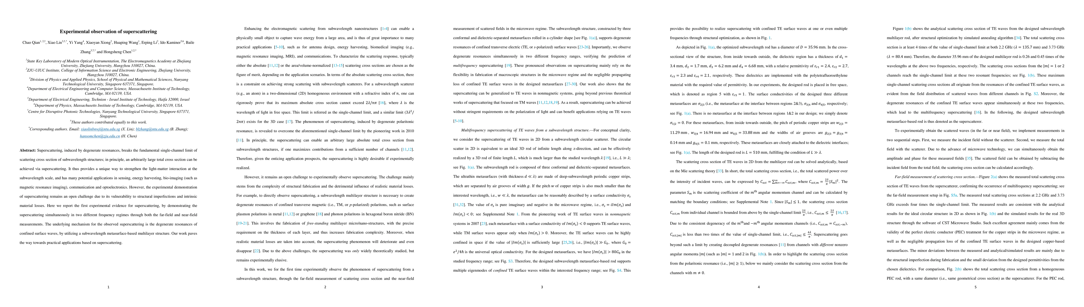 This research paper reports the first experimental demonstration of superscattering, a phenomenon where subwavelength structures can achieve an arbitrarily large scattering cross section by utilizing degenerate resonances. The study verifies superscattering through both far-field and near-field measurements in two frequency regimes, utilizing a metasurface-based multilayer structure.