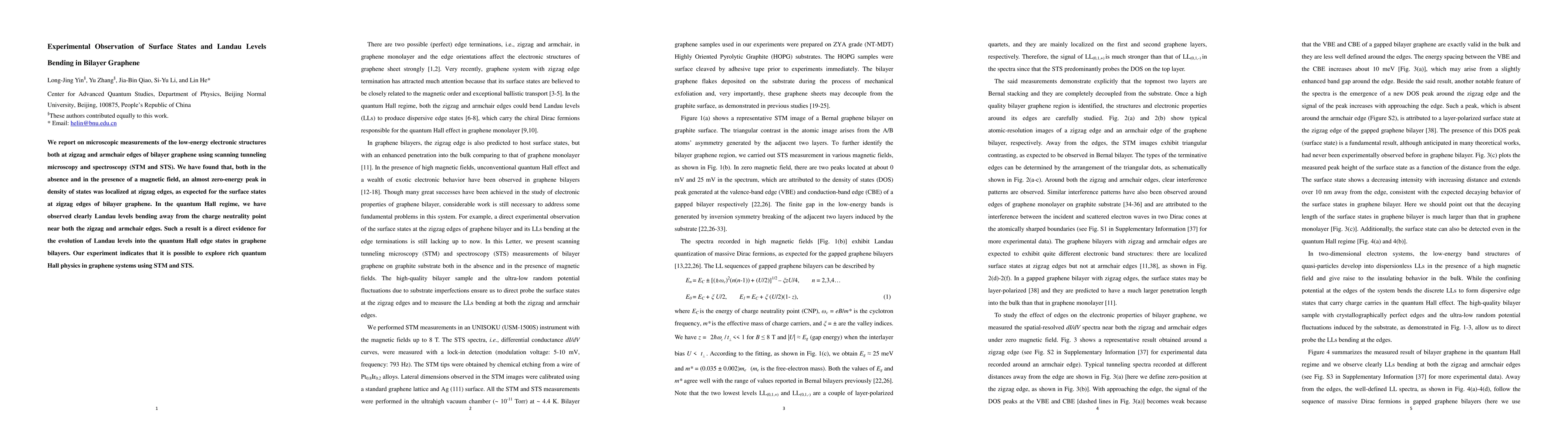 This paper reports on STM and STS measurements revealing surface states and Landau levels bending in bilayer graphene, showing a zero-energy peak at zigzag edges and Landau levels shifting in the quantum Hall regime, indicating potential for studying quantum Hall physics in graphene bilayers.