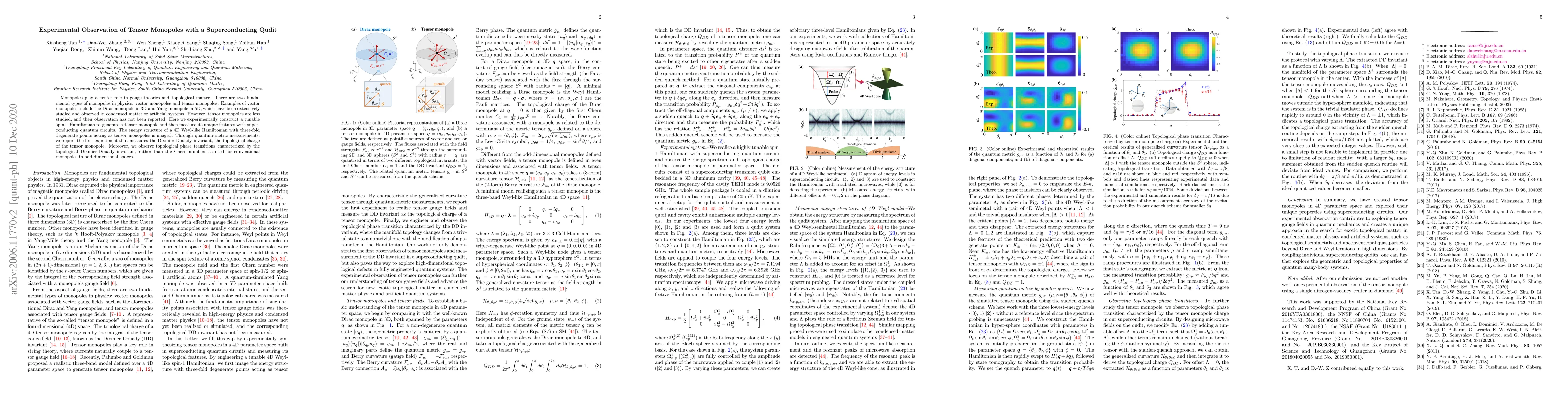 This paper reports the first experimental observation of tensor monopoles using superconducting quantum circuits, constructing a tunable spin-1 Hamiltonian to generate these topological features and measuring their unique properties, including the Dixmier-Douady invariant, which characterizes the topological phase transitions of these monopoles.