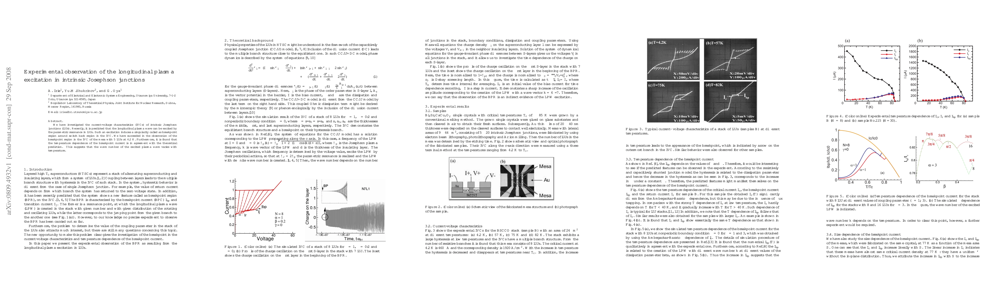 This study experimentally observes the longitudinal plasma excitation in intrinsic Josephson junctions (IJJs), confirming the predicted breakpoint region in their current-voltage characteristics. The findings align with theoretical predictions, indicating that the plasma wave's wave number changes with temperature.