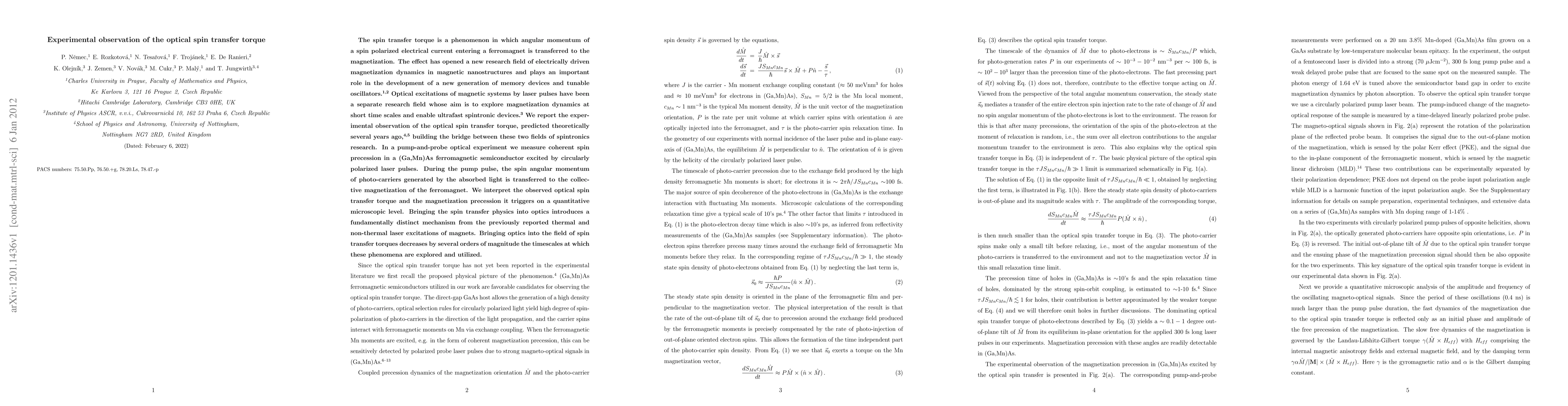 The paper reports the experimental observation of optical spin transfer torque, where spin angular momentum from photo-carriers generated by laser pulses transfers to the magnetization of a ferromagnetic semiconductor, facilitating ultrafast spintronic devices. This bridges spintronics and optical excitations, drastically reducing the timescales for magnetization dynamics.