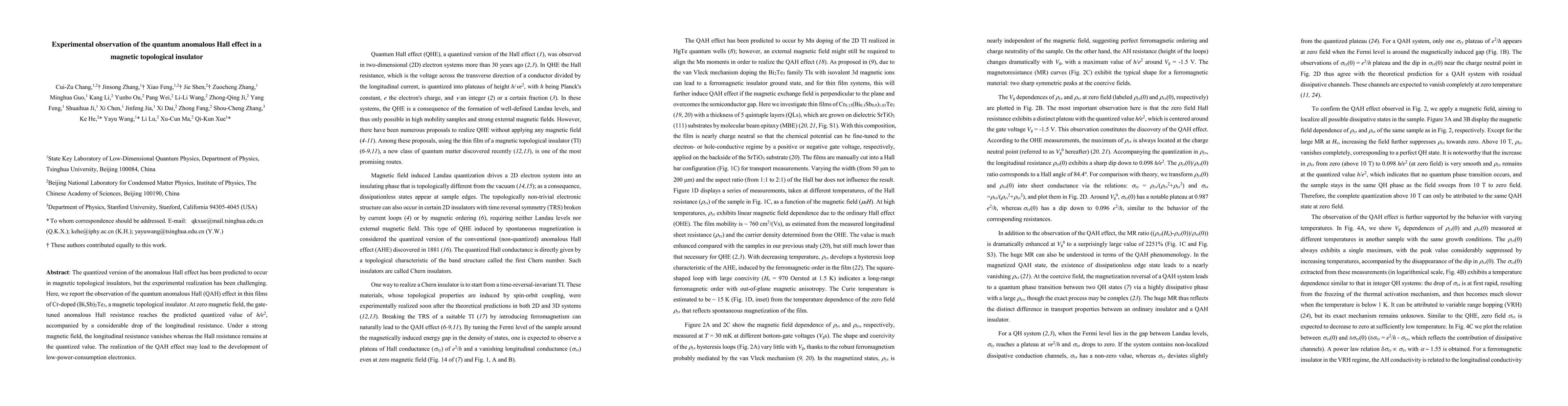 This paper reports the experimental observation of the quantum anomalous Hall effect in Cr-doped (Bi,Sb)2Te3 thin films, demonstrating a quantized Hall resistance at zero magnetic field and maintaining this quantized value even under strong magnetic fields, which suggests potential for low-power electronics.
