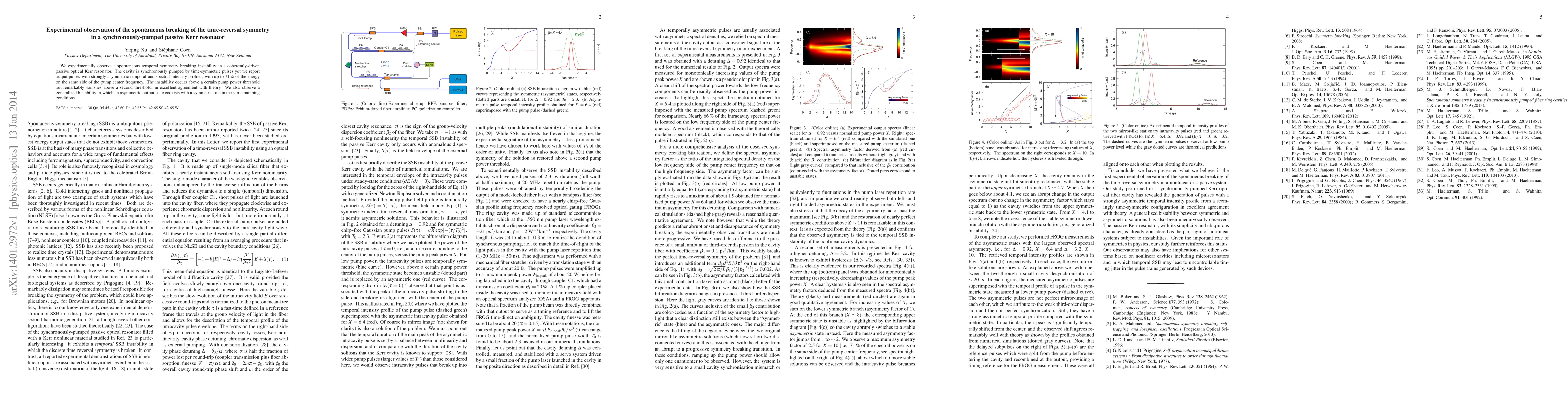 This paper reports the experimental observation of spontaneous breaking of time-reversal symmetry in a passive Kerr resonator, showing asymmetric output pulses above a pump power threshold, with a surprising return to symmetry at a higher threshold. The study also reveals coexisting symmetric and asymmetric states under certain conditions.