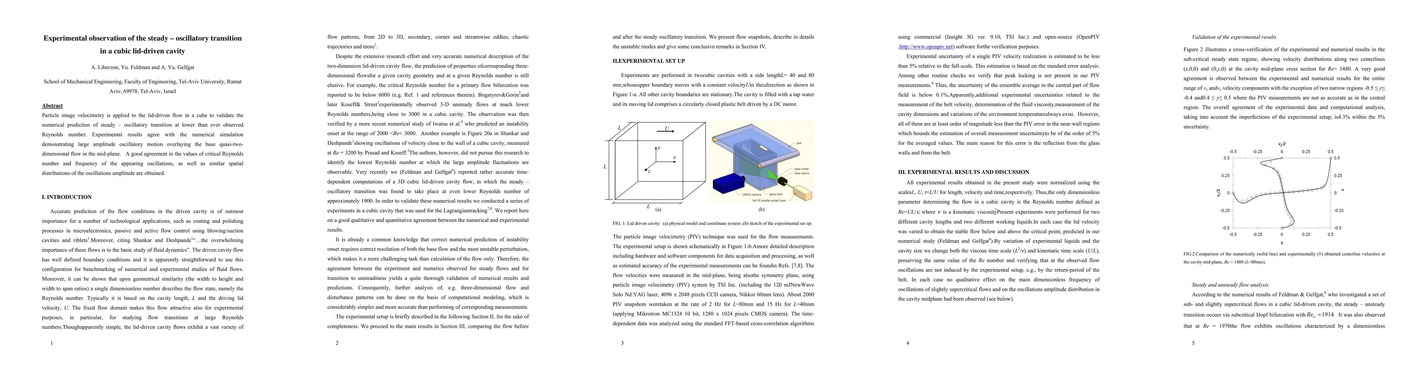 Particle image velocimetry is applied to the lid-driven flow in a cube to validate the numerical prediction of steady - oscillatory transition at lower than ever observed Reynolds number. Experimental results agree with the numerical simulation demonstrating large amplitude oscillatory motion overlaying the base quasi-two-dimensional flow in the mid-plane. A good agreement in the values of critical Reynolds number and frequency of the appearing oscillations, as well as similar spatial distributions of the oscillations amplitude are obtained.