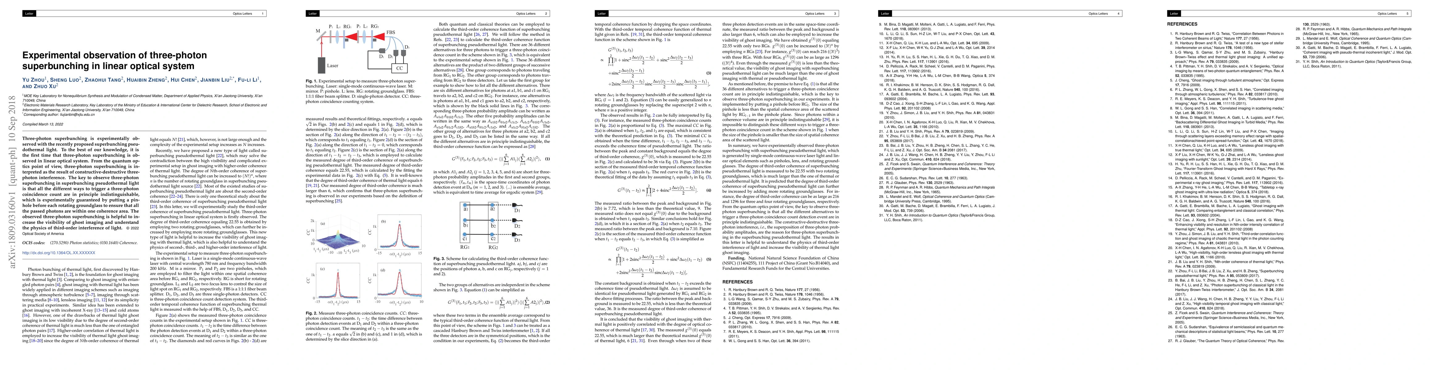 This paper reports the first experimental observation of three-photon superbunching in a linear optical system using superbunching pseudothermal light, highlighting the significance of indistinguishable photon paths for this phenomenon. The findings enhance the understanding of third-order light interference and improve ghost imaging visibility.