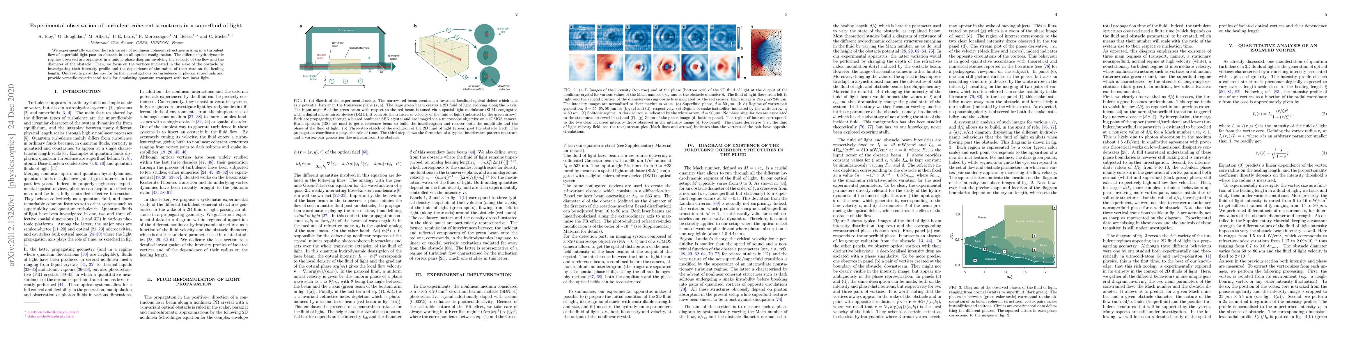 This paper experimentally investigates turbulent coherent structures in superfluid light, revealing a phase diagram for different hydrodynamic regimes based on flow velocity and obstacle size. It also examines vortices in the wake, analyzing their intensity profiles and core radius dependence on the healing length, thus advancing understanding of turbulence in photon superfluids.