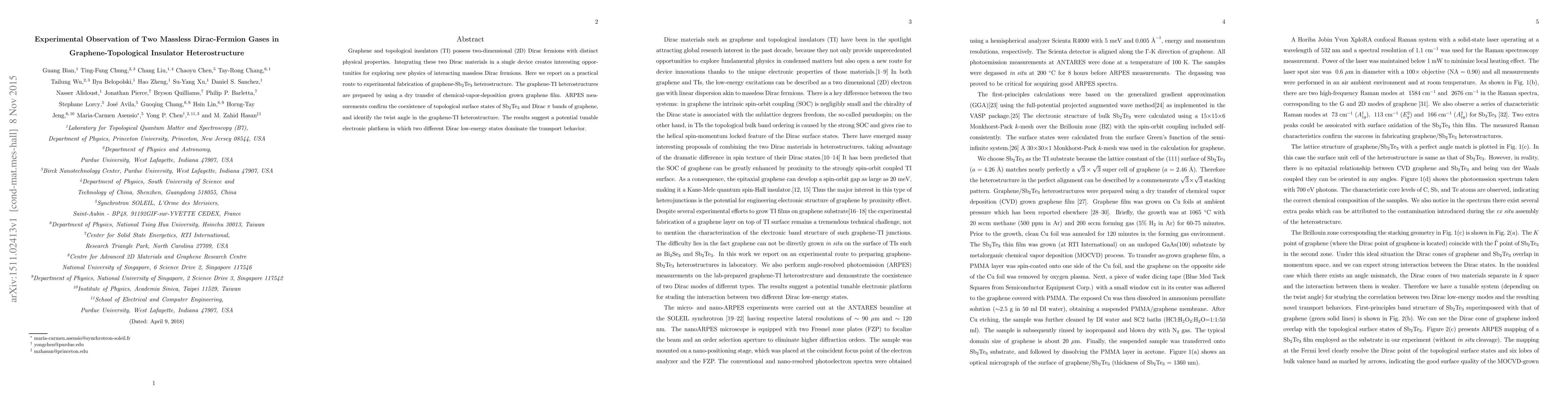 This paper reports the experimental fabrication of a graphene-Sb2Te3 heterostructure, demonstrating the coexistence of topological surface states and Dirac bands through ARPES measurements. The study highlights a tunable electronic platform where two distinct massless Dirac fermions influence transport behavior.