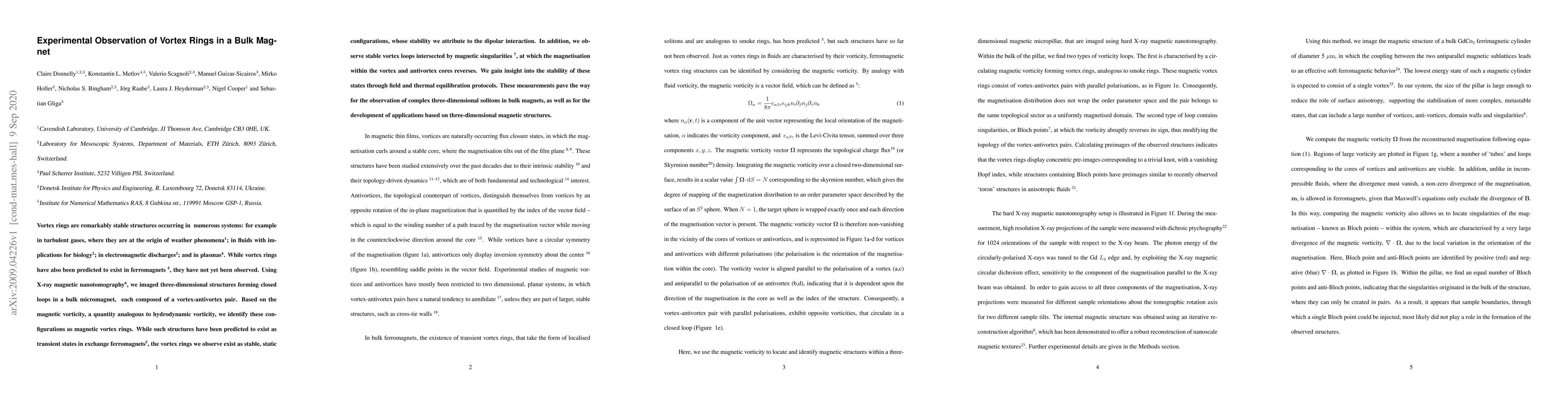 This paper reports the first experimental observation of stable magnetic vortex rings in a bulk micromagnet using X-ray magnetic nanotomography, revealing their formation as static configurations due to dipolar interactions. The study also identifies intersecting vortex loops with magnetic singularities, providing insights into their stability through field and thermal equilibration.