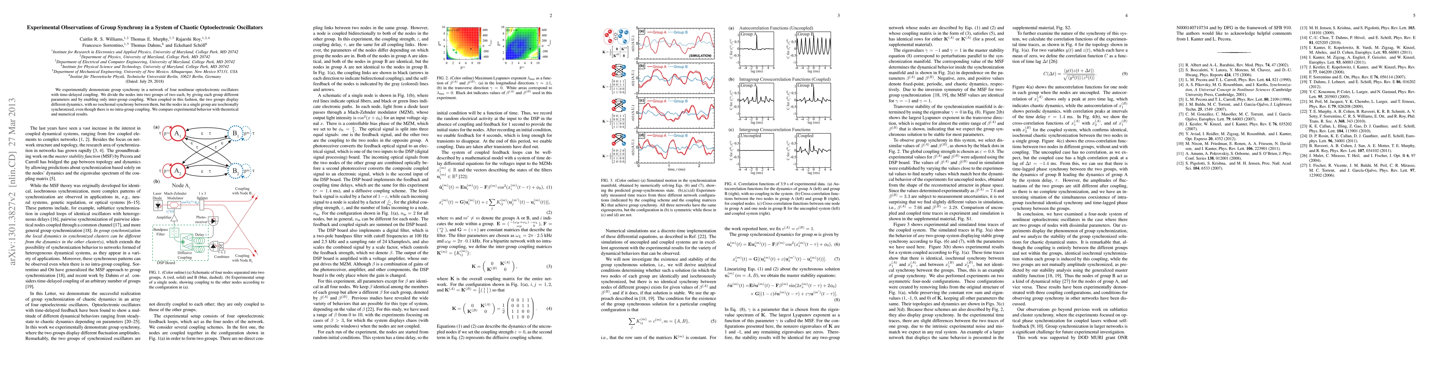This paper experimentally demonstrates group synchrony in a network of four chaotic optoelectronic oscillators with time-delayed coupling, showing that nodes within the same group synchronize despite no intra-group coupling, while inter-group coupling prevents isochronal synchrony between groups. Theoretical and numerical results corroborate the experimental findings.
