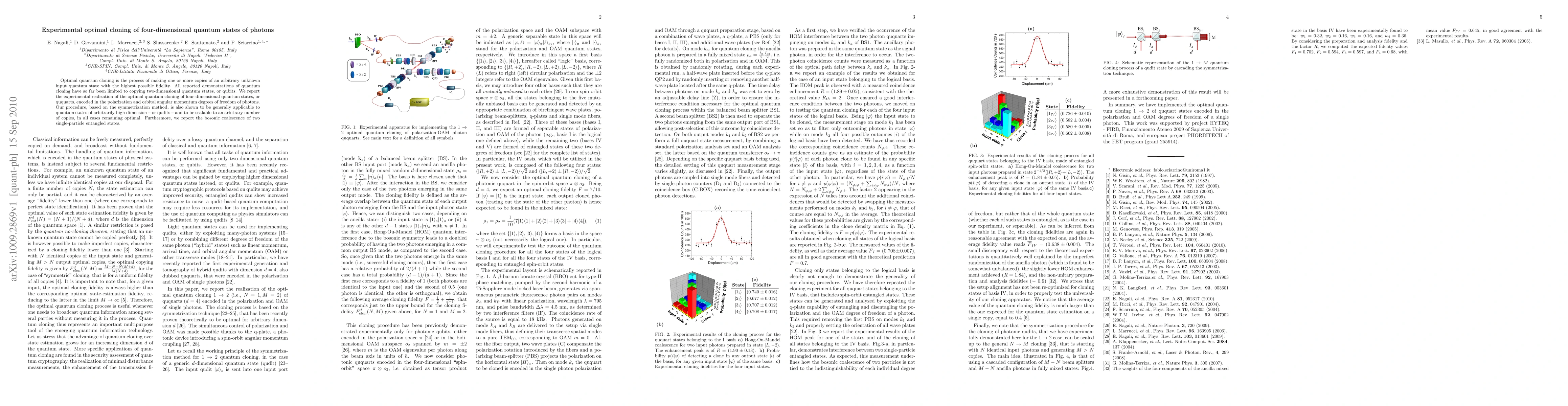 Optimal quantum cloning is the process of making one or more copies of an arbitrary unknown input quantum state with the highest possible fidelity. All reported demonstrations of quantum cloning have so far been limited to copying two-dimensional quantum states, or qubits. We report the experimental realization of the optimal quantum cloning of four-dimensional quantum states, or ququarts, encoded in the polarization and orbital angular momentum degrees of freedom of photons. Our procedure, based on the symmetrization method, is also shown to be generally applicable to quantum states of arbitrarily high dimension -- or qudits -- and to be scalable to an arbitrary number of copies, in all cases remaining optimal. Furthermore, we report the bosonic coalescence of two single-particle entangled states.