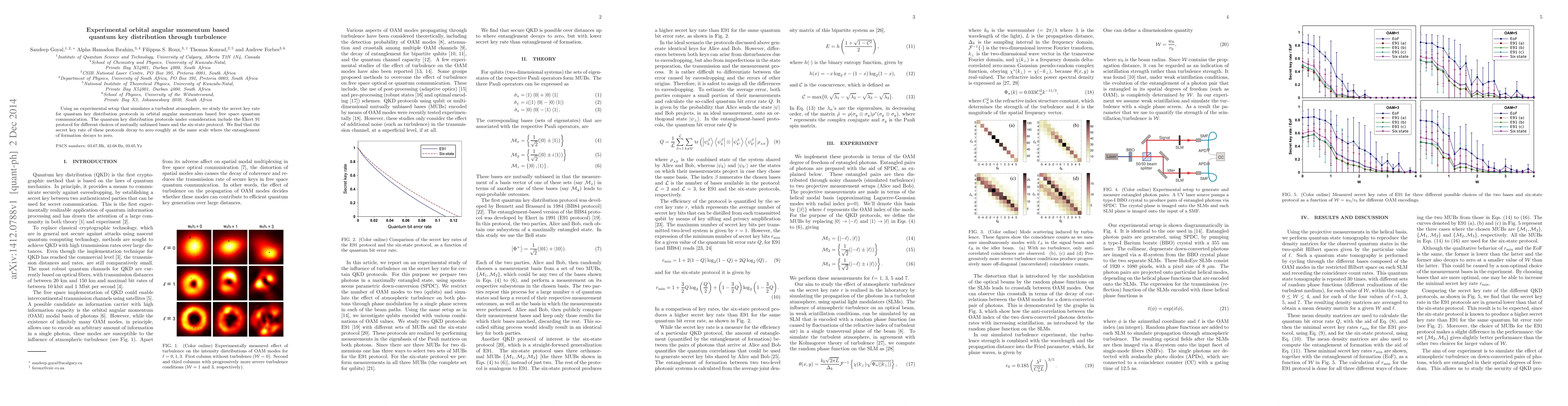 Using an experimental setup that simulates a turbulent atmosphere, we study the secret key rate for quantum key distribution protocols in orbital angular momentum based free space quantum communication. The quantum key distribution protocols under consideration include the Ekert 91 protocol for different choices of mutually unbiased bases and the six-state protocol. We find that the secret key rate of these protocols decay to zero roughly at the same scale where the entanglement of formation decays to zero.