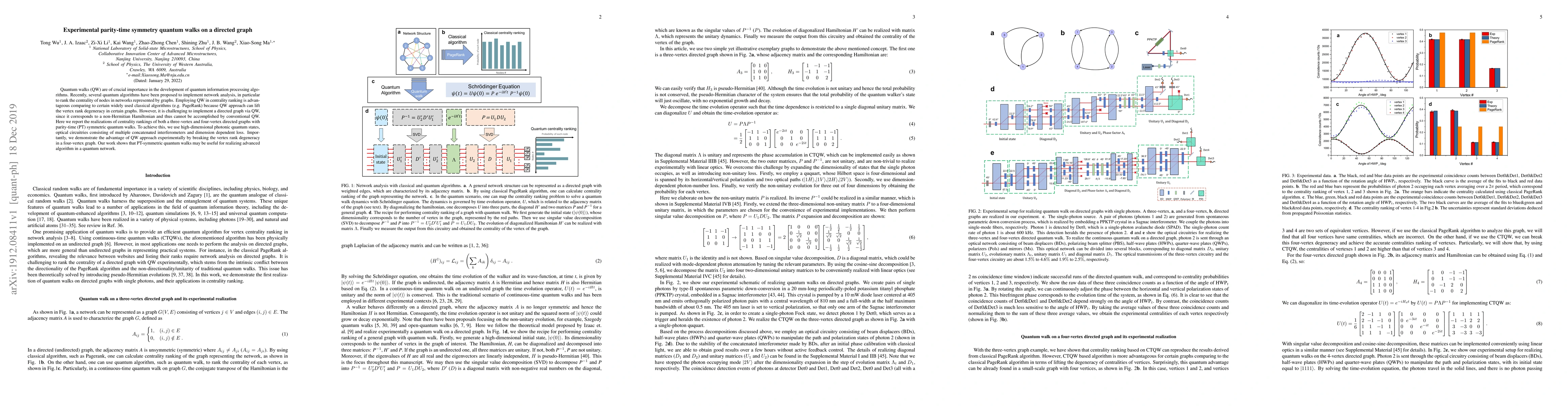 The research implements centrality rankings on directed graphs using parity-time (PT) symmetric quantum walks with high-dimensional photonic quantum states and optical circuitries consisting of multiple concatenated interferometers and dimension-dependent loss.