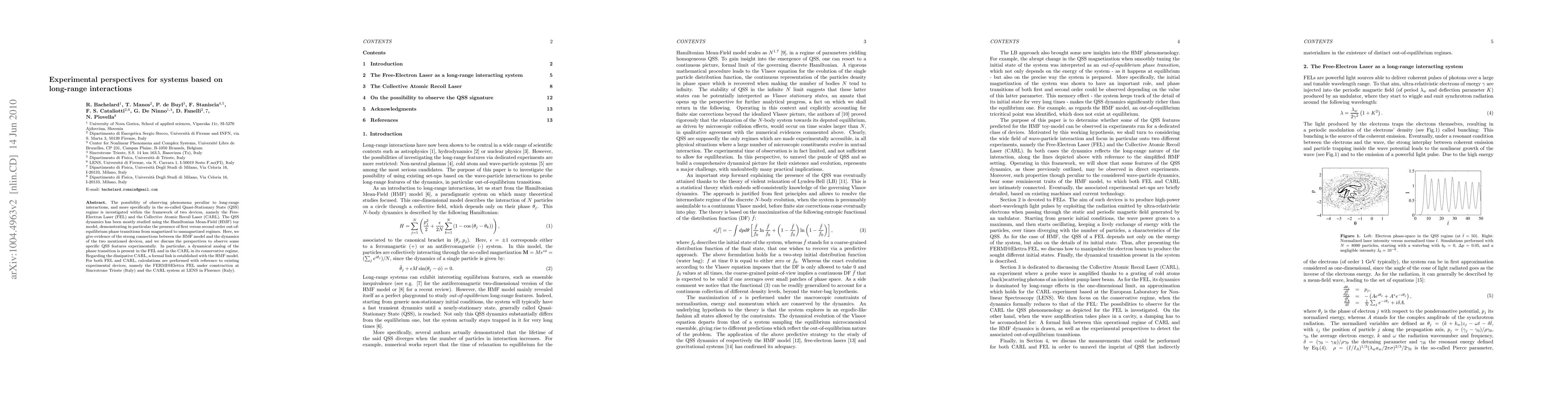 The possibility of observing phenomena peculiar to long-range interactions, and more specifically in the so-called Quasi-Stationary State (QSS) regime is investigated within the framework of two devices, namely the Free-Electron Laser (FEL) and the Collective Atomic Recoil Laser (CARL). The QSS dynamics has been mostly studied using the Hamiltonian Mean-Field (HMF) toy model, demonstrating in particular the presence of first versus second order phase transitions from magnetized to unmagnetized regimes in the case of HMF. Here, we give evidence of the strong connections between the HMF model and the dynamics of the two mentioned devices, and we discuss the perspectives to observe some specific QSS features experimentally. In particular, a dynamical analog of the phase transition is present in the FEL and in the CARL in its conservative regime. Regarding the dissipative CARL, a formal link is established with the HMF model. For both FEL and CARL, calculations are performed with reference to existing experimental devices, namely the FERMI@Elettra FEL under construction at Sincrotrone Trieste (Italy) and the CARL system at LENS in Florence (Italy).