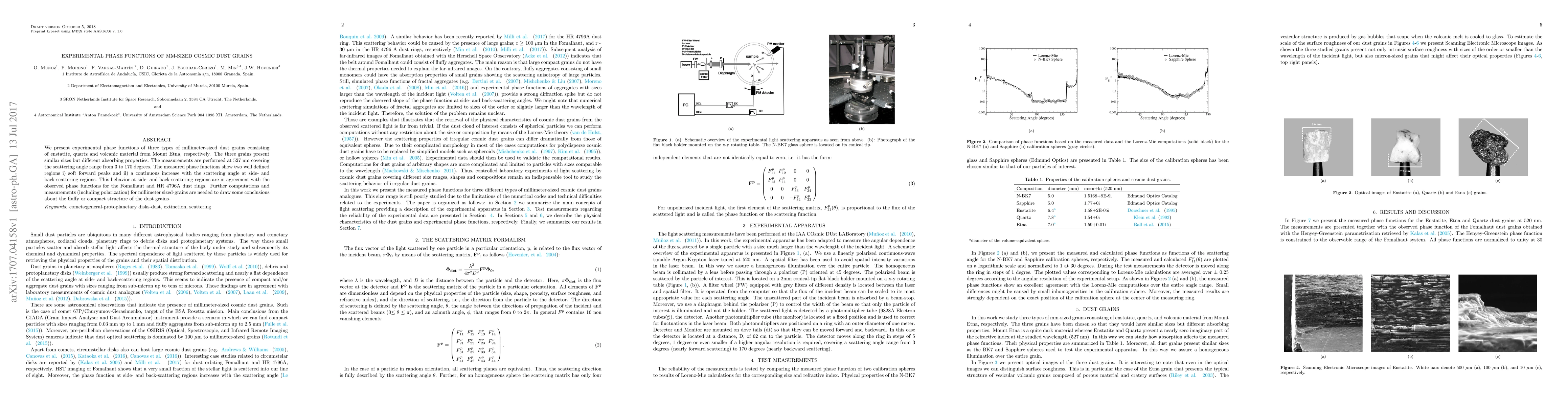 This paper experimentally measures the phase functions of three types of millimeter-sized cosmic dust grains, revealing distinct scattering behaviors with forward peaks and increasing scattering at larger angles, similar to observed dust rings. Further studies are needed to determine the structural characteristics of these grains.