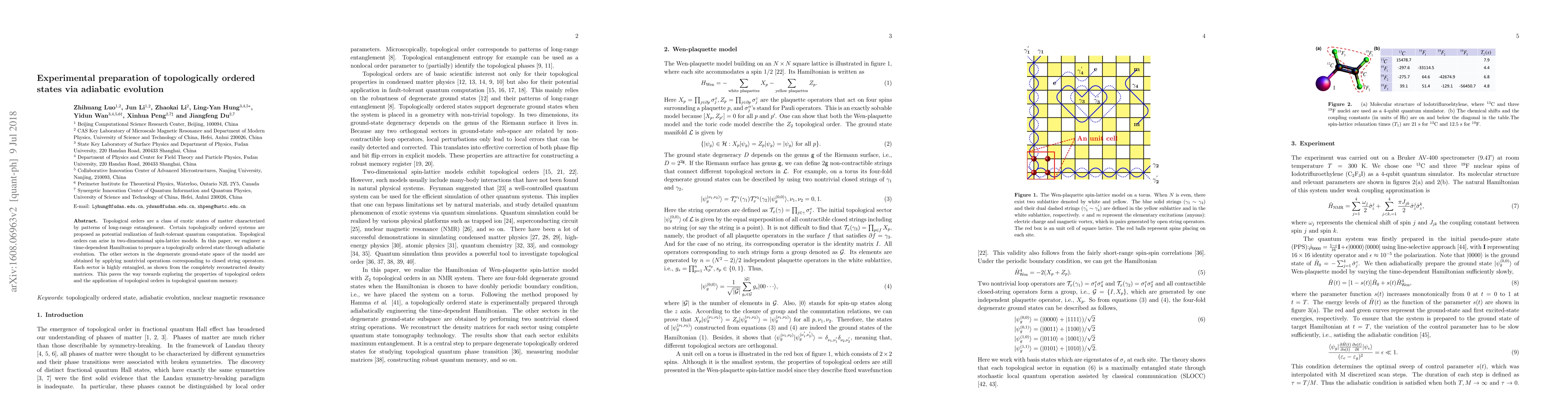 This paper details the experimental preparation of topologically ordered states using adiabatic evolution in two-dimensional spin-lattice models. The study demonstrates the creation of highly entangled sectors through engineered time-dependent Hamiltonians and explores their potential for fault-tolerant quantum computation and topological quantum memory.