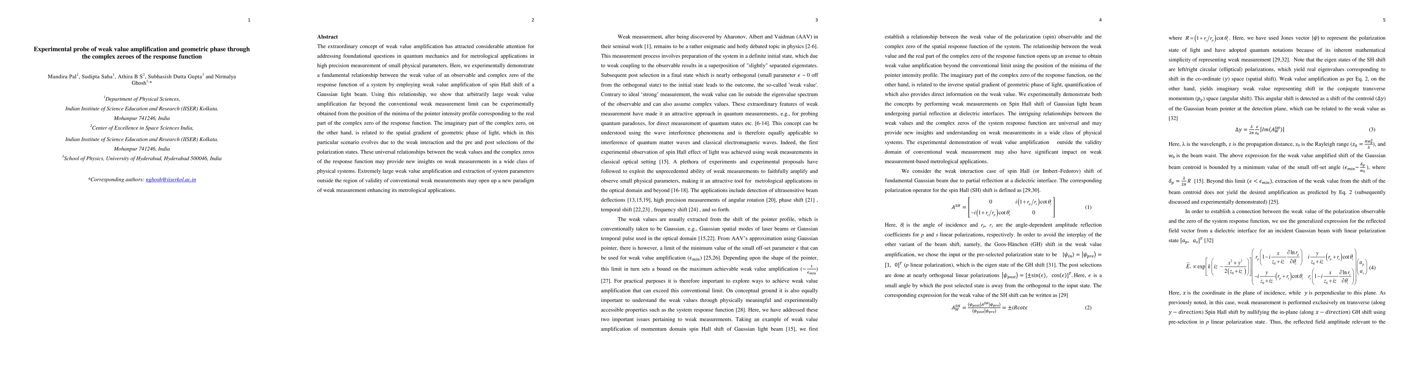 This paper experimentally demonstrates a fundamental link between weak value amplification and the complex zeroes of the response function, showing large amplifications beyond conventional limits. The study uses spin Hall shift of a Gaussian light beam, revealing that the real part of the complex zero corresponds to large weak value amplification, while the imaginary part relates to the spatial gradient of geometric phase.