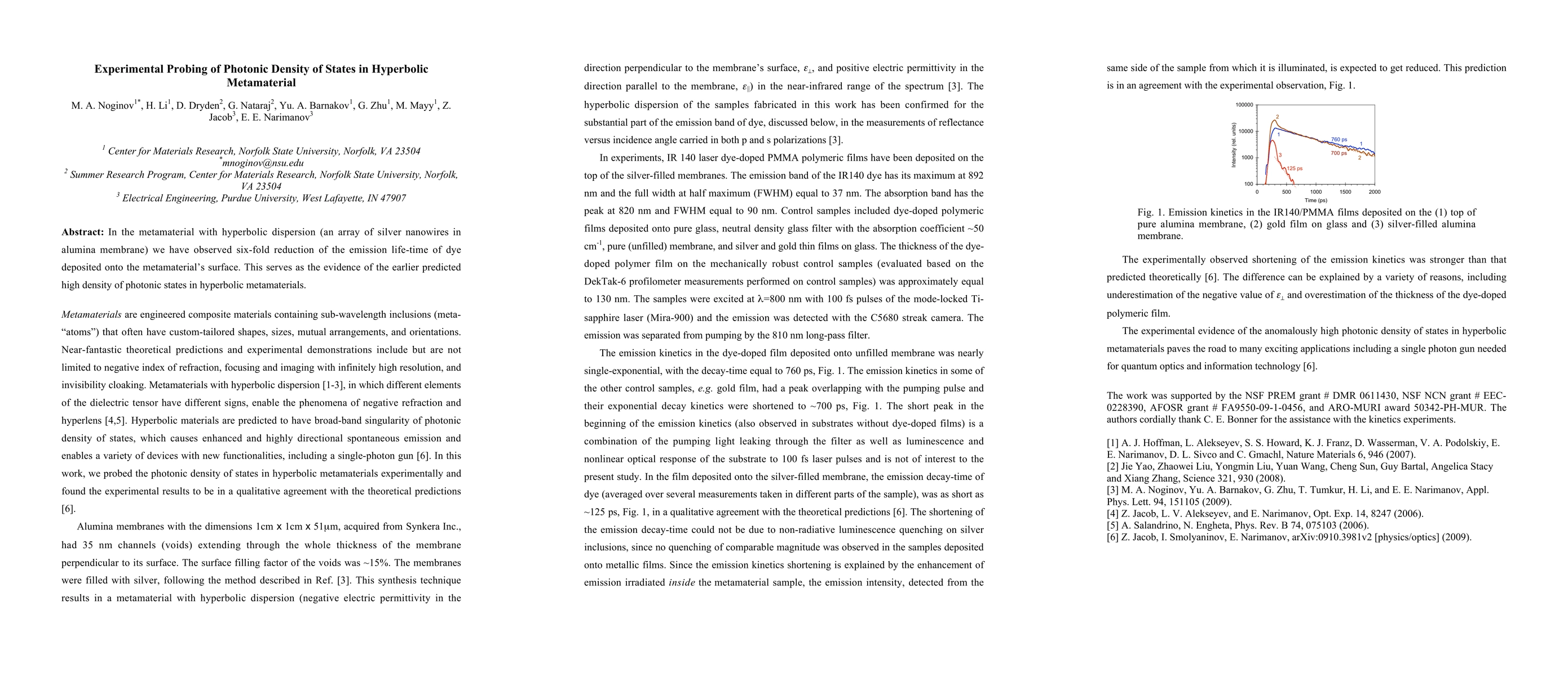 This study experimentally demonstrates a six-fold reduction in dye emission lifetime on hyperbolic metamaterials, confirming the presence of a high photonic density of states, as predicted earlier. The metamaterial consists of an array of silver nanowires in an alumina membrane.