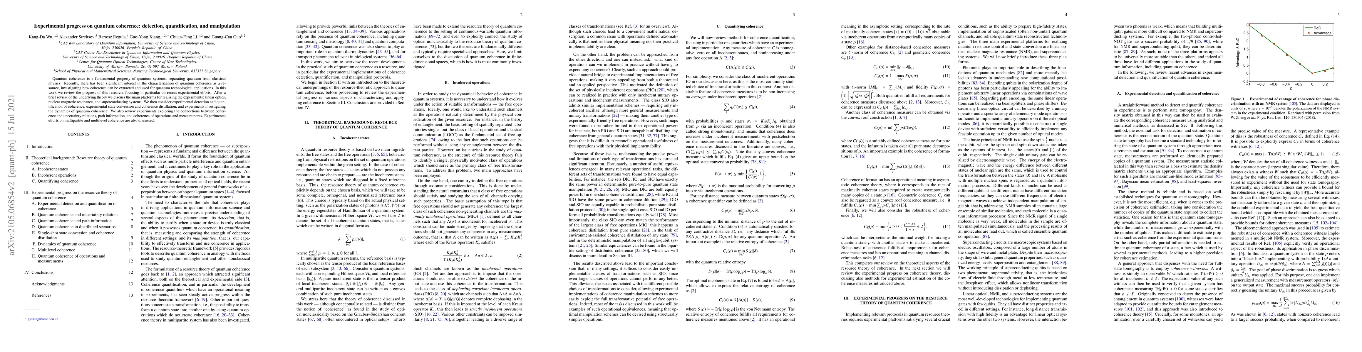 This paper reviews recent experimental advancements in detecting, quantifying, and manipulating quantum coherence, emphasizing platforms like linear optics, NMR, and superconducting systems. It discusses coherence extraction, state conversion, and dynamics, alongside connections to uncertainty relations and multipartite coherence.