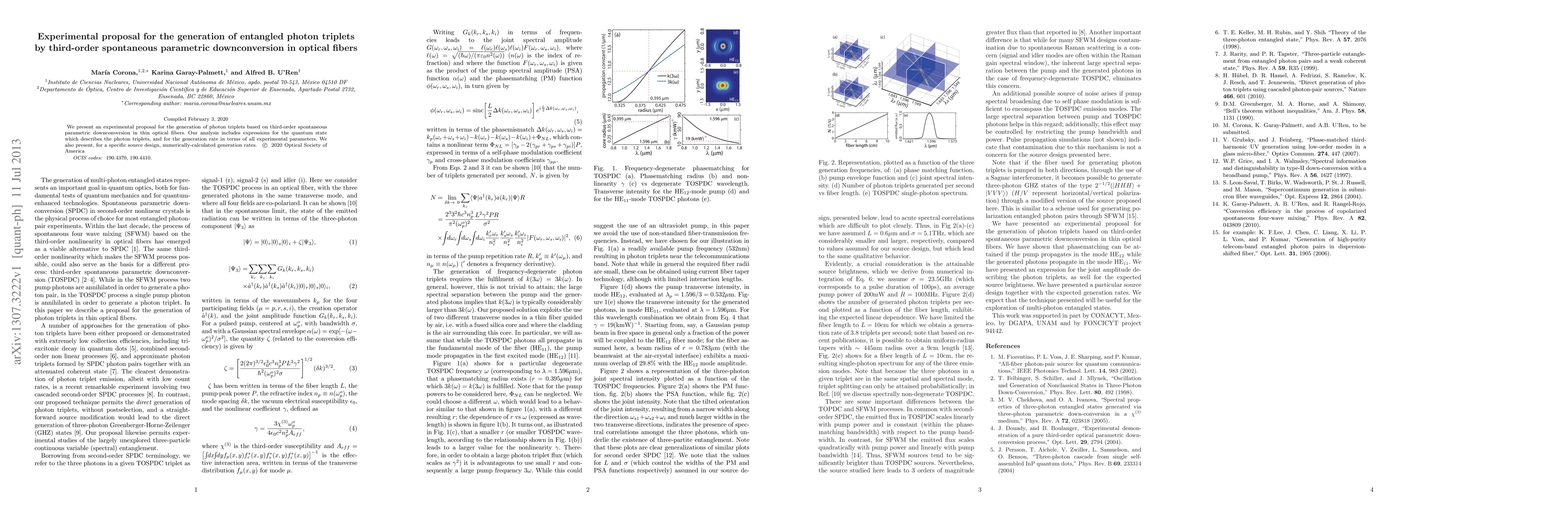 This research proposes an experimental method for generating entangled photon triplets using third-order spontaneous parametric downconversion within thin optical fibers. The study provides theoretical expressions for the quantum state of the photon triplets and calculates the generation rate based on various experimental parameters.