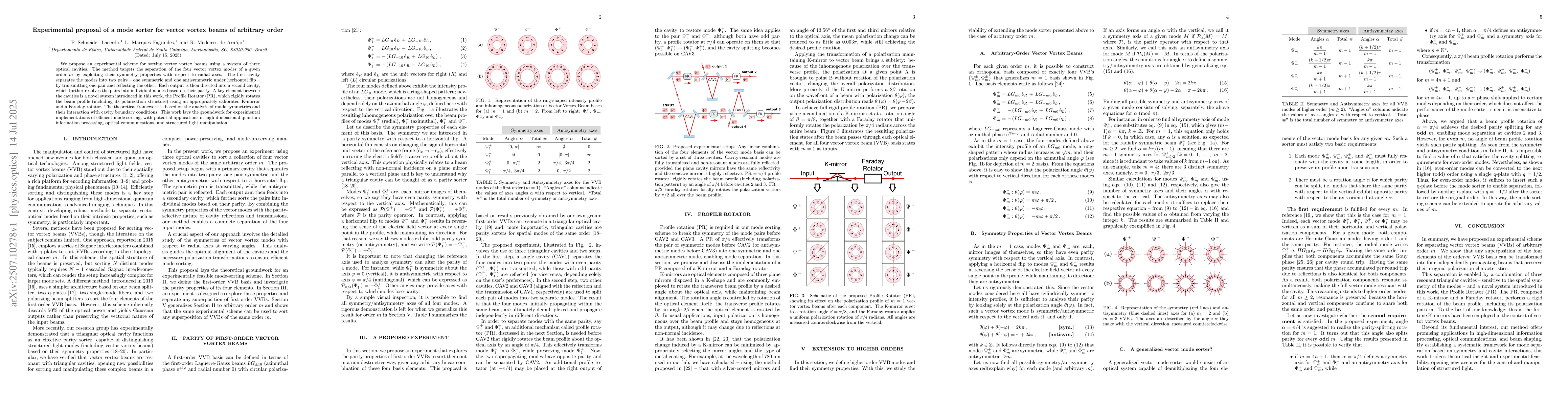 We propose an experimental scheme for sorting vector vortex beams using a system of three optical cavities. The method targets the separation of the four vector vortex modes of a given order m by exploiting their symmetry properties with respect to radial axes. The first cavity separates the modes into two pairs, one symmetric and one antisymmetric under horizontal flip, by transmitting one pair and reflecting the other. Each output is then directed into a second cavity, which further resolves the pairs into individual modes based on their parity. A key element between the cavities is a novel system introduced in this work, the Profile Rotator (PR), which rigidly rotates the beam profile (including its polarization structure) using an appropriately calibrated K-mirror and a Faraday rotator. The theoretical framework is based on the analysis of mode symmetries and their interaction with cavity boundary conditions. This work lays the groundwork for experimental implementations of efficient mode sorting, with potential applications in high-dimensional quantum information processing, optical communications, and structured light manipulation.