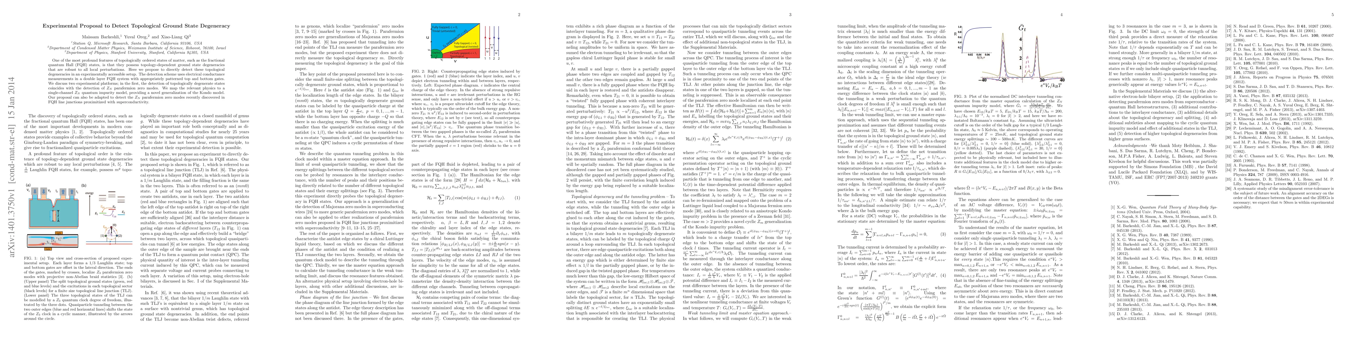 One of the most profound features of topologically ordered states of matter, such as the fractional quantum Hall (FQH) states, is that they possess topology-dependent ground state degeneracies that are robust to all local perturbations. Here we propose to directly detect these topological degeneracies in an experimentally accessible setup. The detection scheme uses electrical conductance measurements in a double layer FQH system with appropriately patterned top and bottom gates. We discuss two experimental platforms; in the first, the detection of topologically degenerate states coincides with the detection of $Z_N$ parafermion zero modes. We map the relevant physics to a single-channel $Z_N$ quantum impurity model, providing a novel generalization of the Kondo model. Our proposal can also be adapted to detect the $Z_N$ parafermion zero modes recently discovered in FQH line junctions proximitized with superconductivity.