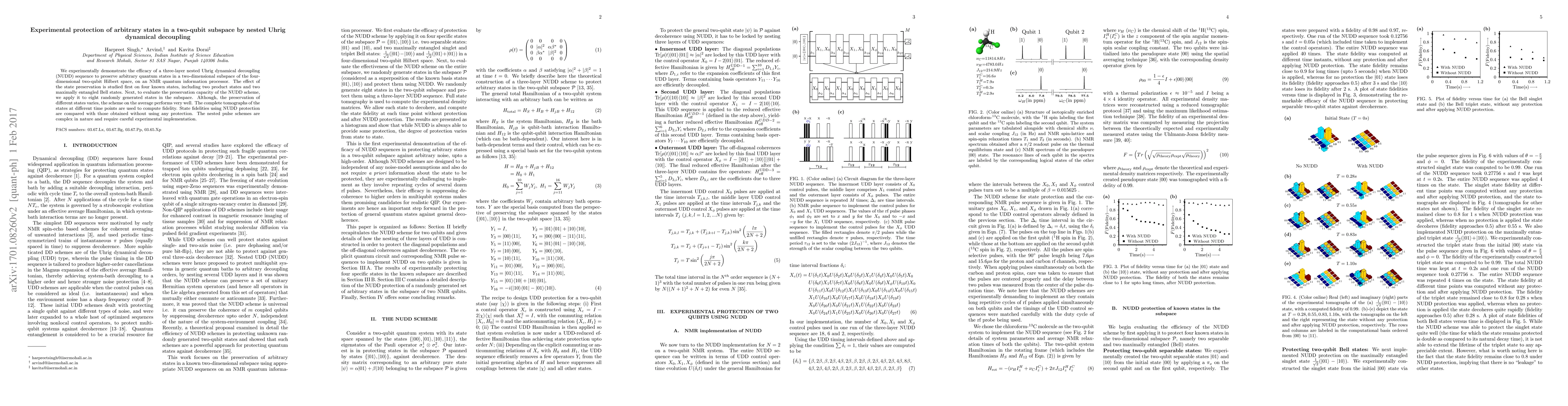 This paper demonstrates the effectiveness of a three-layer nested Uhrig dynamical decoupling (NUDD) sequence for preserving arbitrary quantum states in a two-qubit system using NMR. The NUDD scheme shows good average performance in maintaining fidelity for both known and randomly generated states, though preservation varies for different states.
