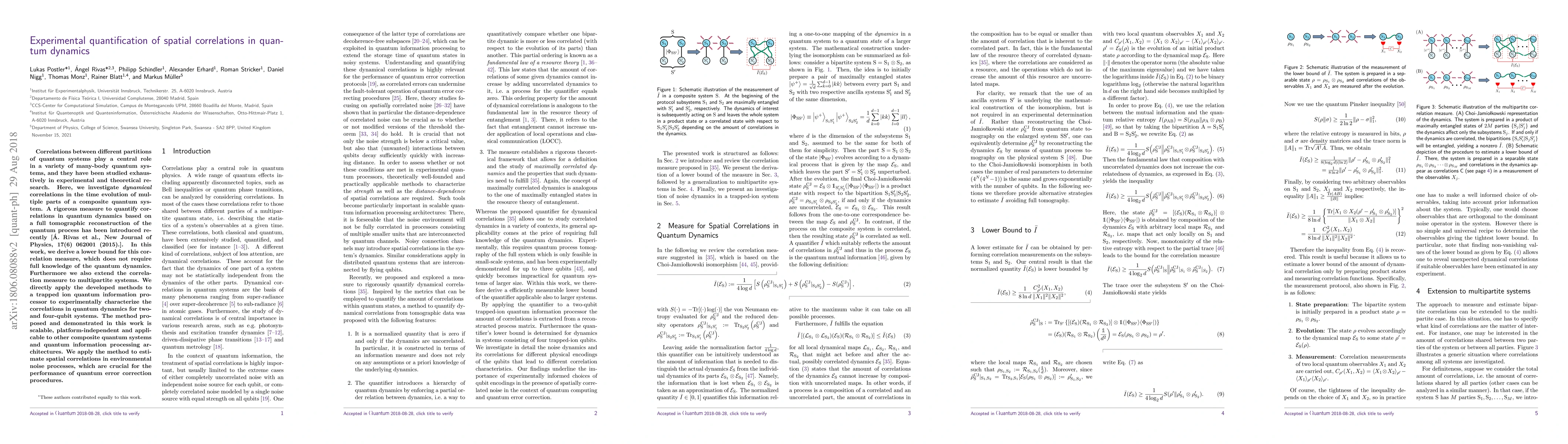 Correlations between different partitions of quantum systems play a central role in a variety of many-body quantum systems, and they have been studied exhaustively in experimental and theoretical research. Here, we investigate dynamical correlations in the time evolution of multiple parts of a composite quantum system. A rigorous measure to quantify correlations in quantum dynamics based on a full tomographic reconstruction of the quantum process has been introduced recently [\'A. Rivas et al., New Journal of Physics, 17(6) 062001 (2015).]. In this work, we derive a lower bound for this correlation measure, which does not require full knowledge of the quantum dynamics. Furthermore we also extend the correlation measure to multipartite systems. We directly apply the developed methods to a trapped ion quantum information processor to experimentally characterize the correlations in quantum dynamics for two- and four-qubit systems. The method proposed and demonstrated in this work is scalable, platform-independent and applicable to other composite quantum systems and quantum information processing architectures. We apply the method to estimate spatial correlations in environmental noise processes, which are crucial for the performance of quantum error correction procedures.