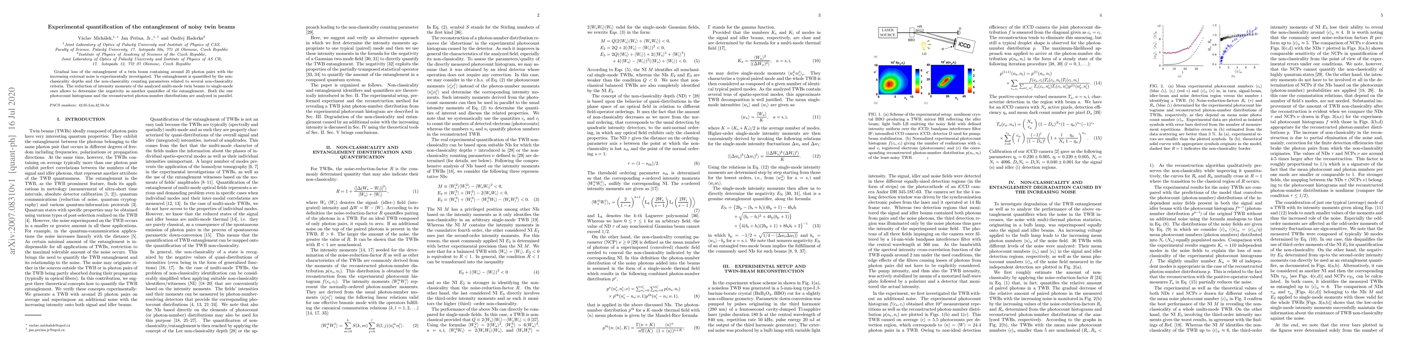 This paper experimentally investigates the degradation of entanglement in noisy twin beams, quantifying it through non-classicality depths and counting parameters. The study also employs intensity moment reduction and negativity as additional entanglement measures, analyzing both raw photocount histograms and reconstructed photon-number distributions.