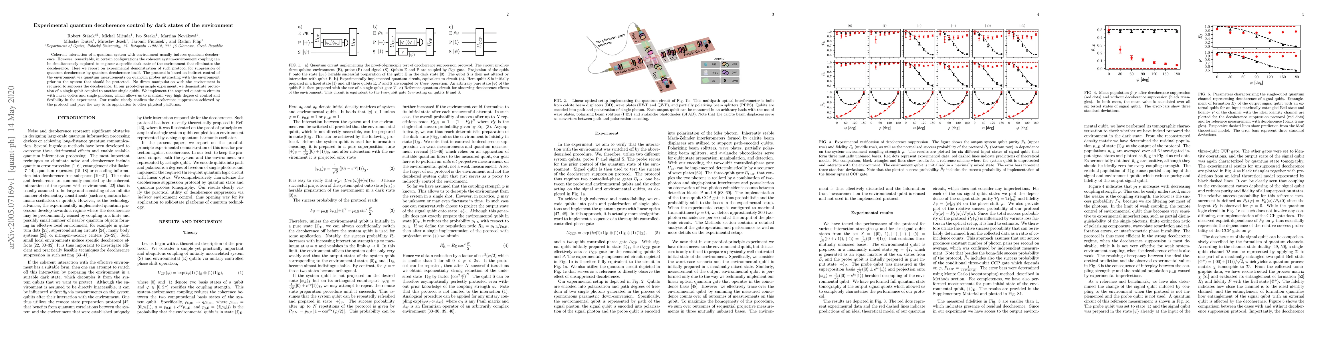 This paper demonstrates an experimental protocol for suppressing quantum decoherence by engineering a specific dark state of the environment, achieved through indirect control via quantum measurements on probes. The method successfully protects a single qubit using linear optics and single photons, confirming the effectiveness of the decoherence suppression technique.