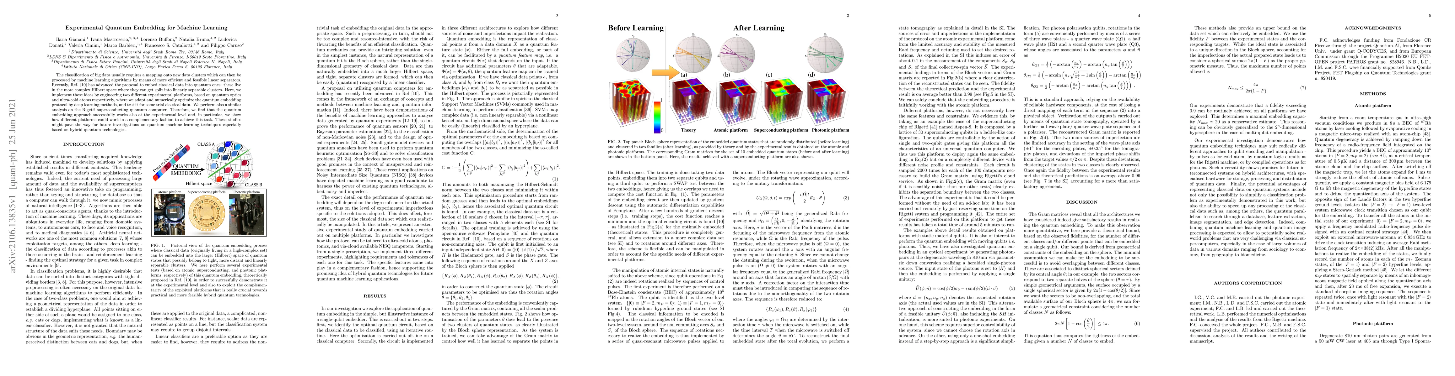 The classification of big data usually requires a mapping onto new data clusters which can then be processed by machine learning algorithms by means of more efficient and feasible linear separators. Recently, Lloyd et al. have advanced the proposal to embed classical data into quantum ones: these live in the more complex Hilbert space where they can get split into linearly separable clusters. Here, we implement these ideas by engineering two different experimental platforms, based on quantum optics and ultra-cold atoms respectively, where we adapt and numerically optimize the quantum embedding protocol by deep learning methods, and test it for some trial classical data. We perform also a similar analysis on the Rigetti superconducting quantum computer. Therefore, we find that the quantum embedding approach successfully works also at the experimental level and, in particular, we show how different platforms could work in a complementary fashion to achieve this task. These studies might pave the way for future investigations on quantum machine learning techniques especially based on hybrid quantum technologies.