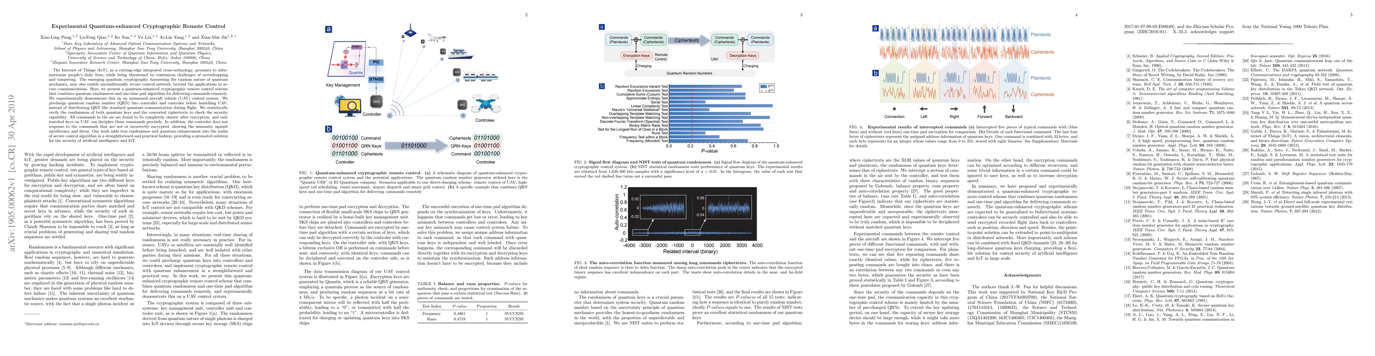 This paper presents a quantum-enhanced cryptographic remote control scheme using quantum randomness and one-time pad for secure command delivery, experimentally demonstrated on a UAV system. The scheme ensures true randomness and security against interference, offering a practical solution for IoT security.