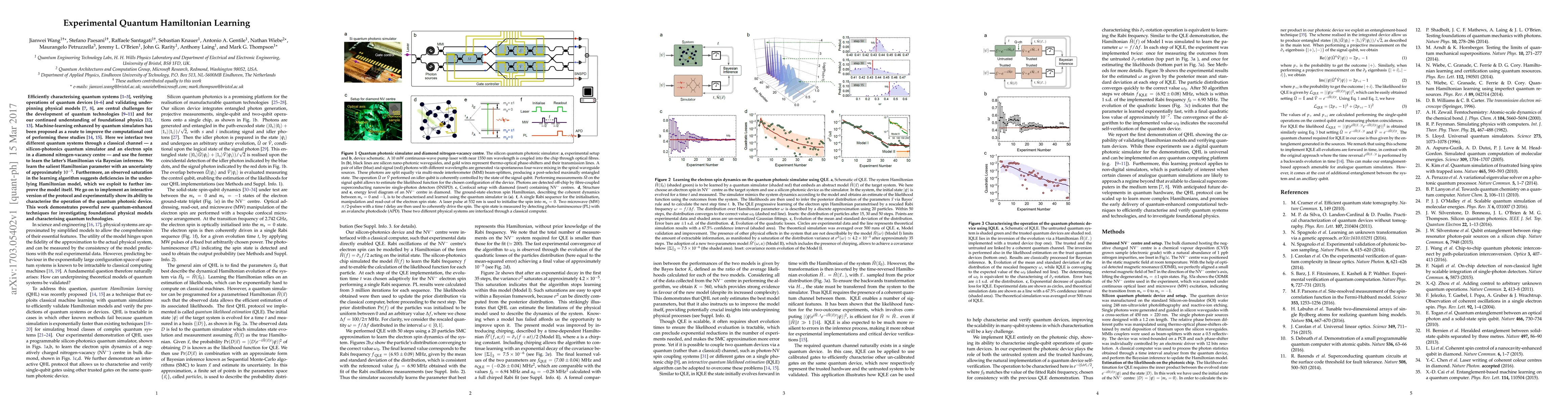 Efficiently characterising quantum systems, verifying operations of quantum devices and validating underpinning physical models, are central challenges for the development of quantum technologies and for our continued understanding of foundational physics. Machine-learning enhanced by quantum simulators has been proposed as a route to improve the computational cost of performing these studies. Here we interface two different quantum systems through a classical channel - a silicon-photonics quantum simulator and an electron spin in a diamond nitrogen-vacancy centre - and use the former to learn the latter's Hamiltonian via Bayesian inference. We learn the salient Hamiltonian parameter with an uncertainty of approximately $10^{-5}$. Furthermore, an observed saturation in the learning algorithm suggests deficiencies in the underlying Hamiltonian model, which we exploit to further improve the model itself. We go on to implement an interactive version of the protocol and experimentally show its ability to characterise the operation of the quantum photonic device. This work demonstrates powerful new quantum-enhanced techniques for investigating foundational physical models and characterising quantum technologies.